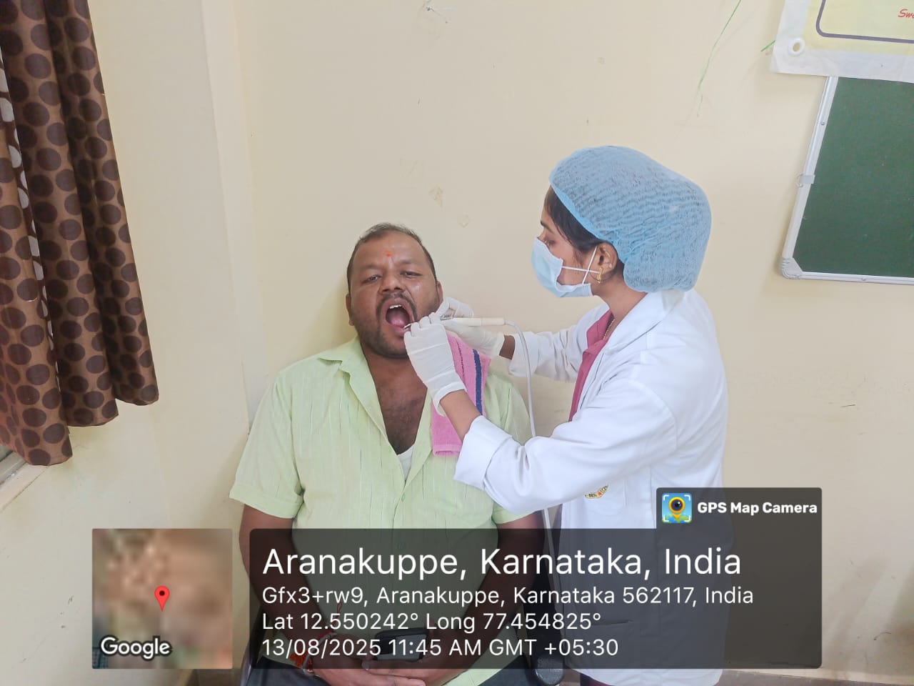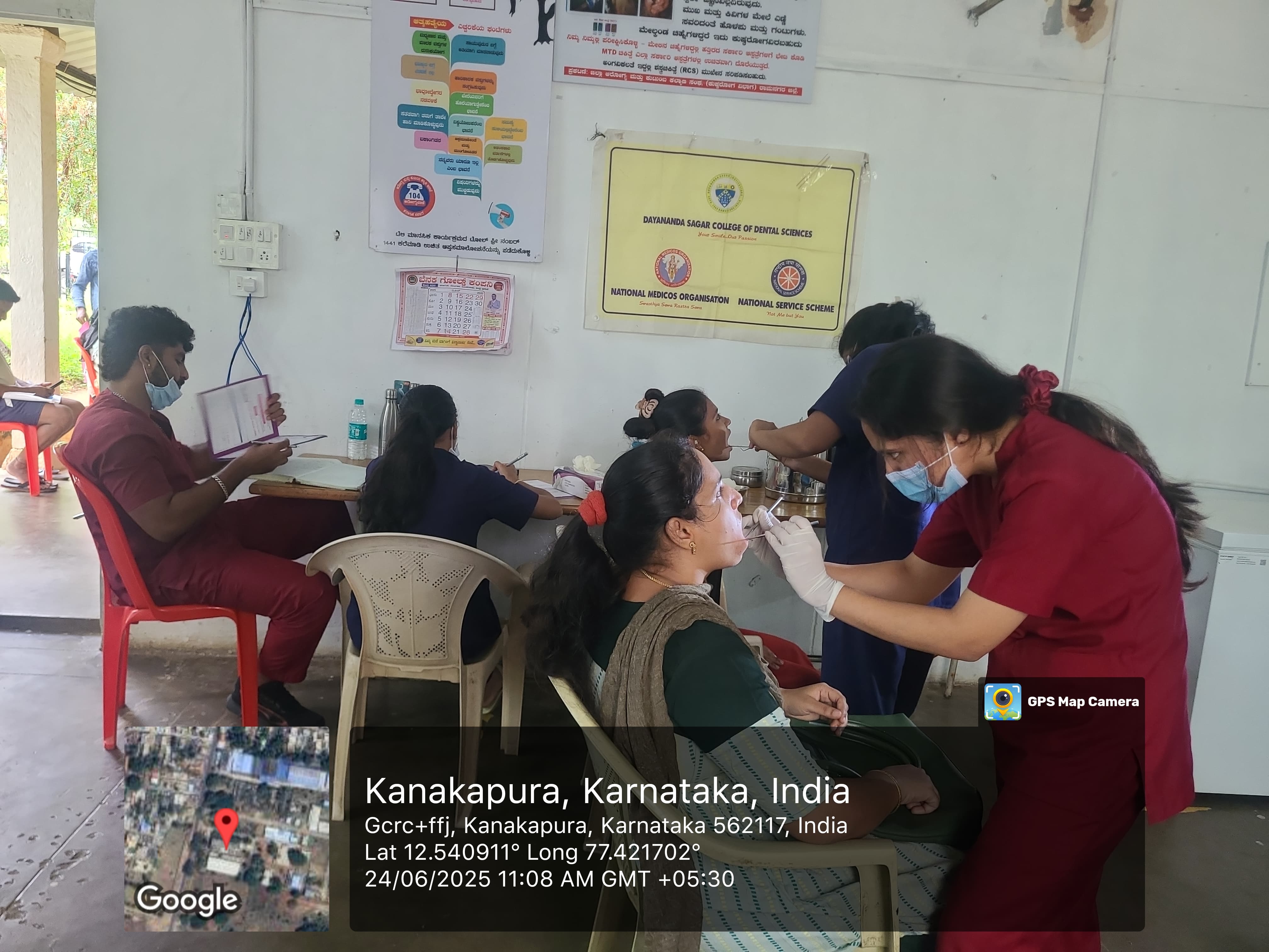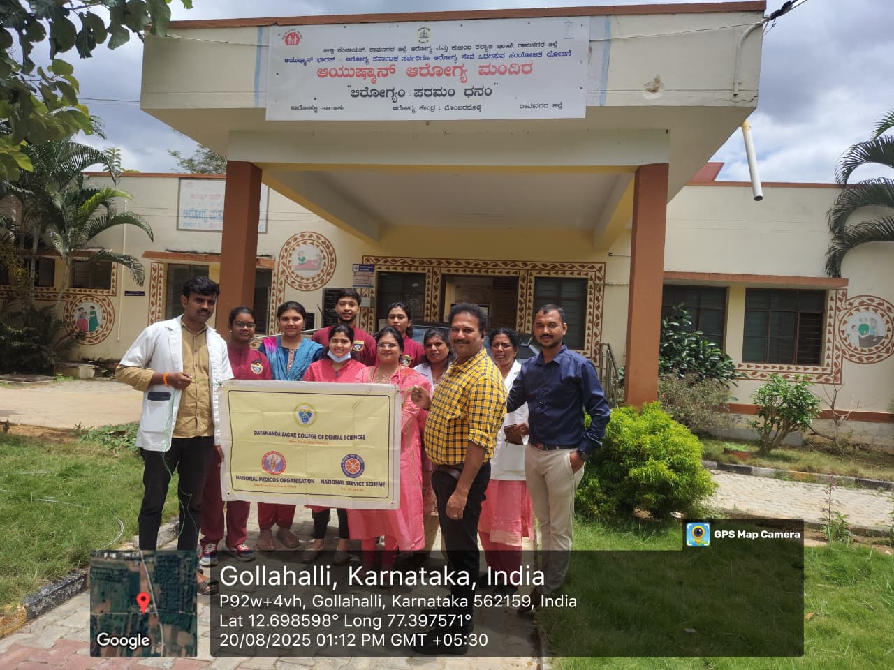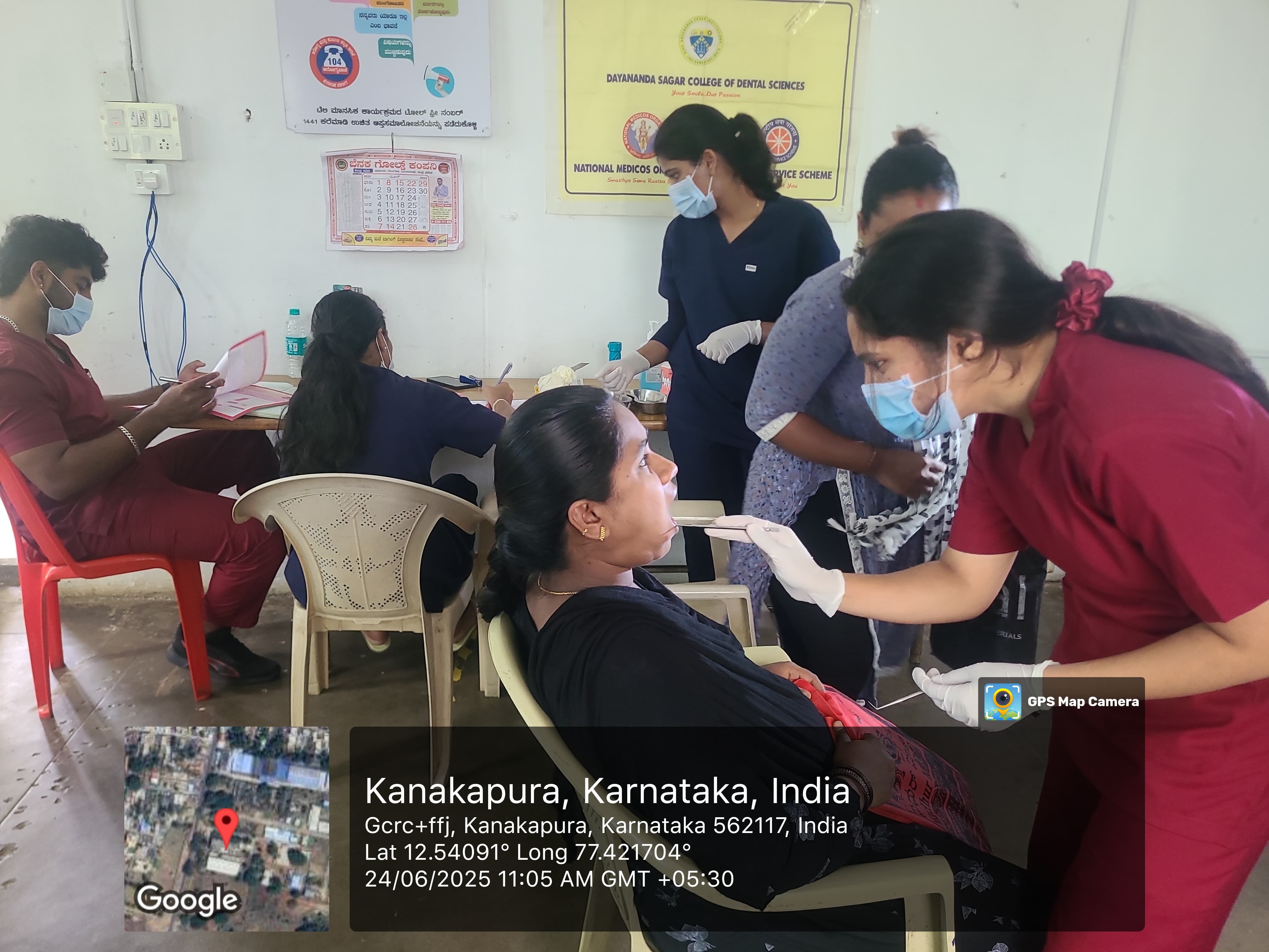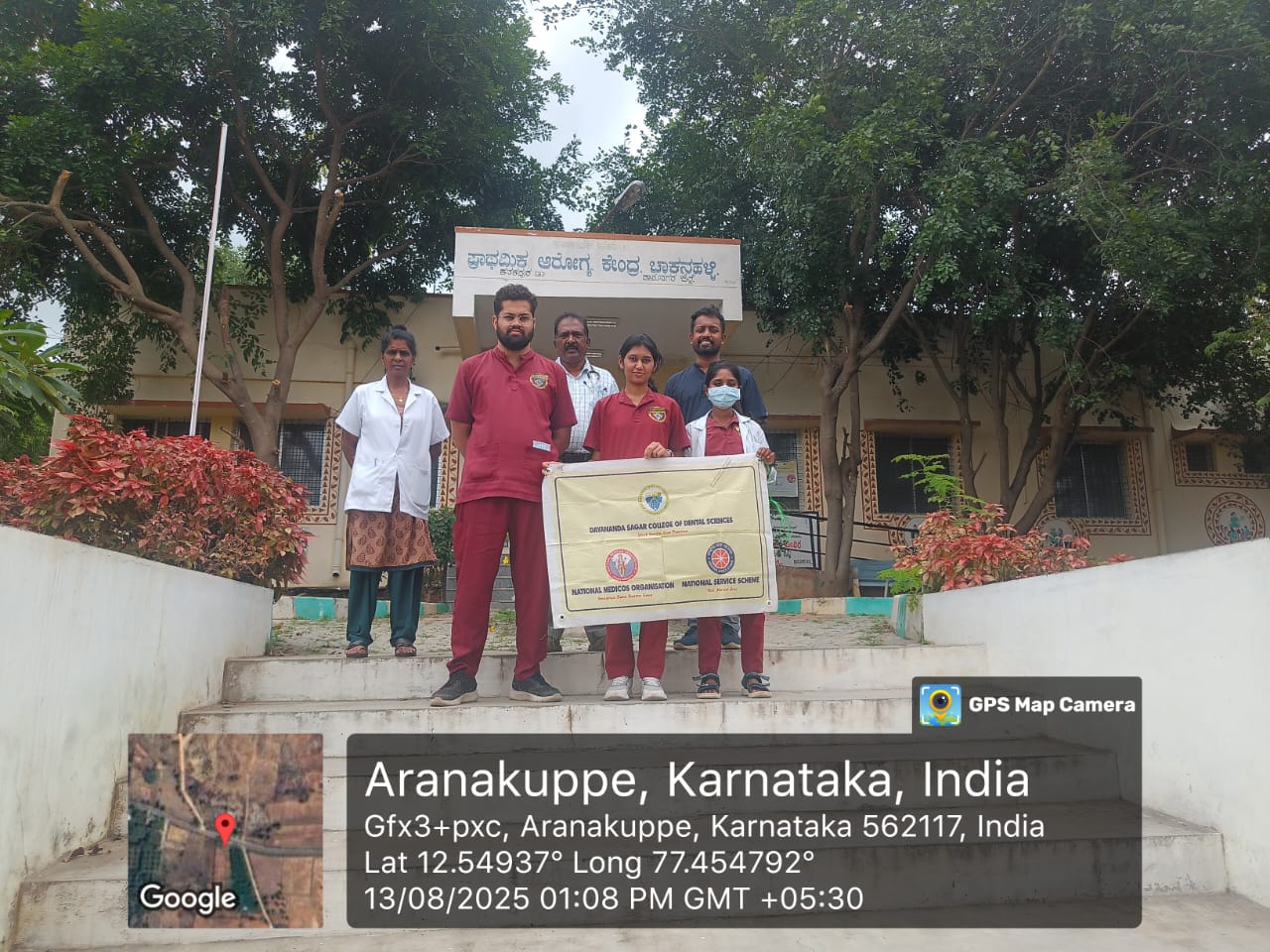 An outreach program of dental treatment was organized at PHC Aranakuppe , Kanakpura , on 13th August 2025 . The designated location from the college was about 60km. A team of four dental doctors from Dayananda Sagar College of Dental Sciences was coordinated by Dr.Prajwal Prabhu, Senior Lecturer,Department of Orthodontics. The dental team started from college at 9:00am am with basic equipment and portable dental unit and reached the camp site by 10:30am. The camp started at 10:30am and went on till 2:00pm. The treatments included scaling and restoration of teeth. After lunch the team left the camp site by 02.30pm and reached the college by 03:30pm.