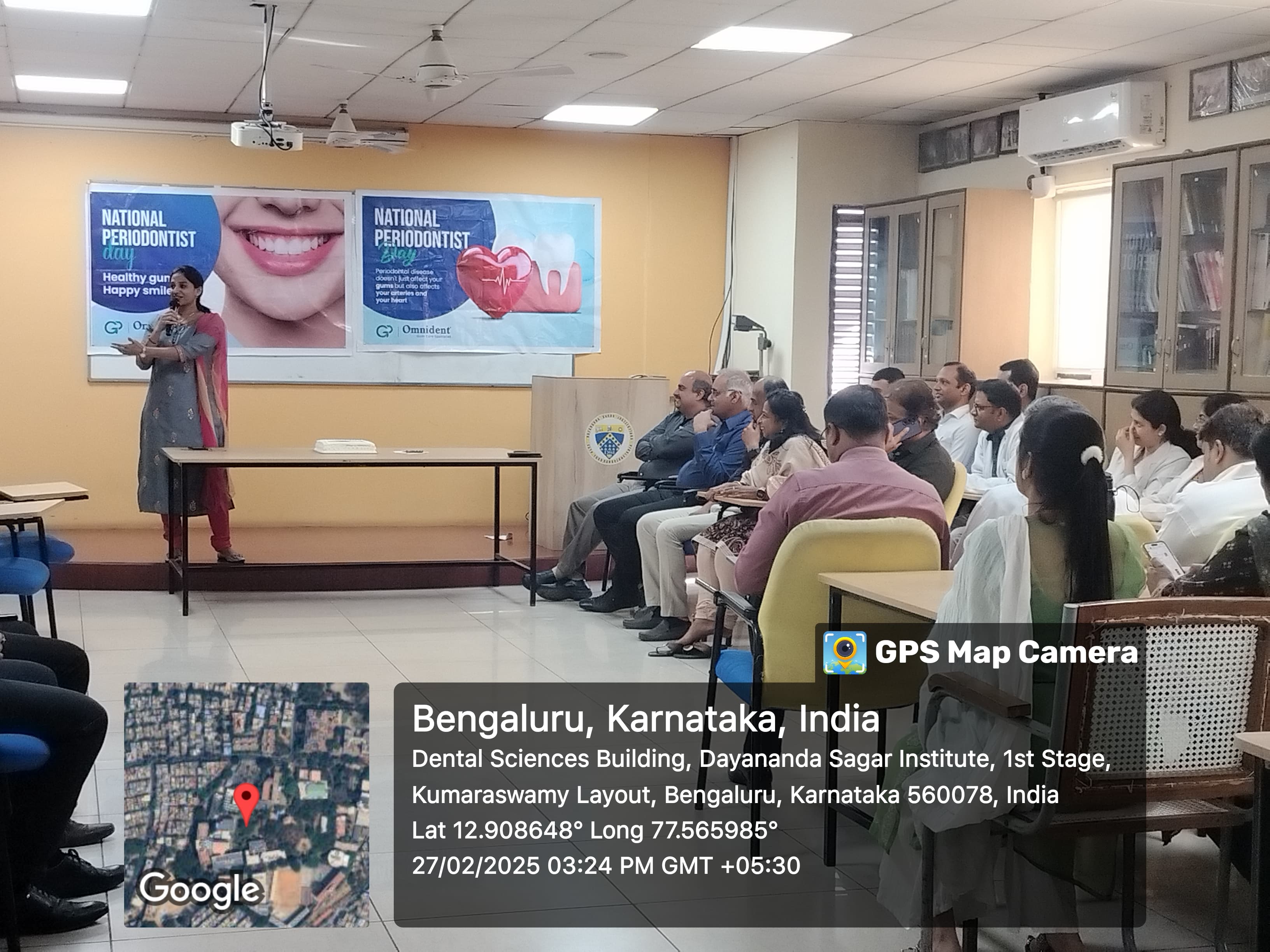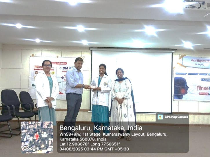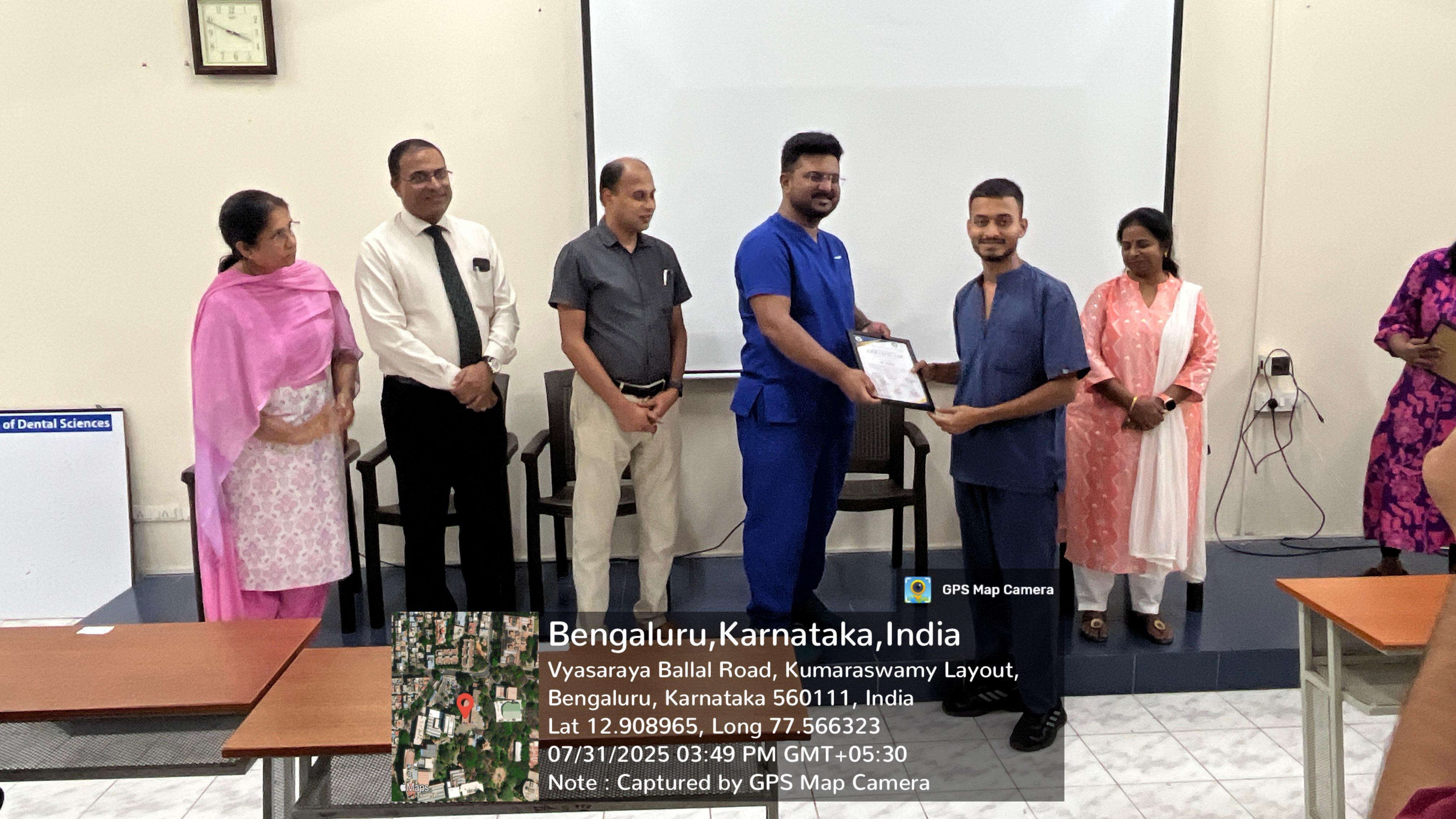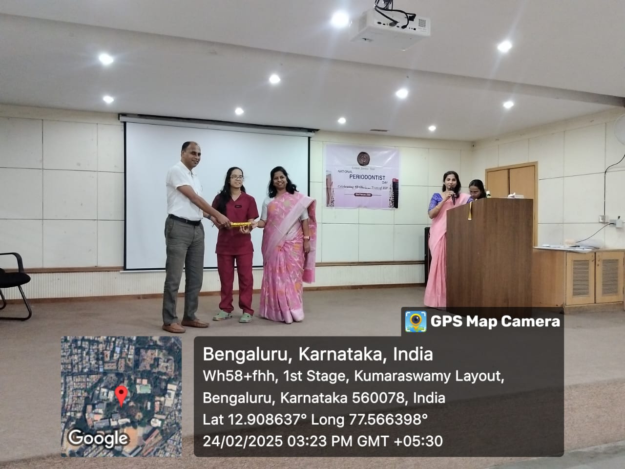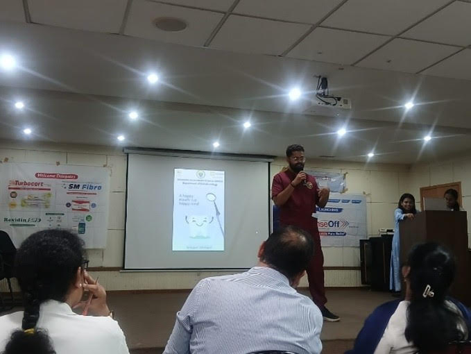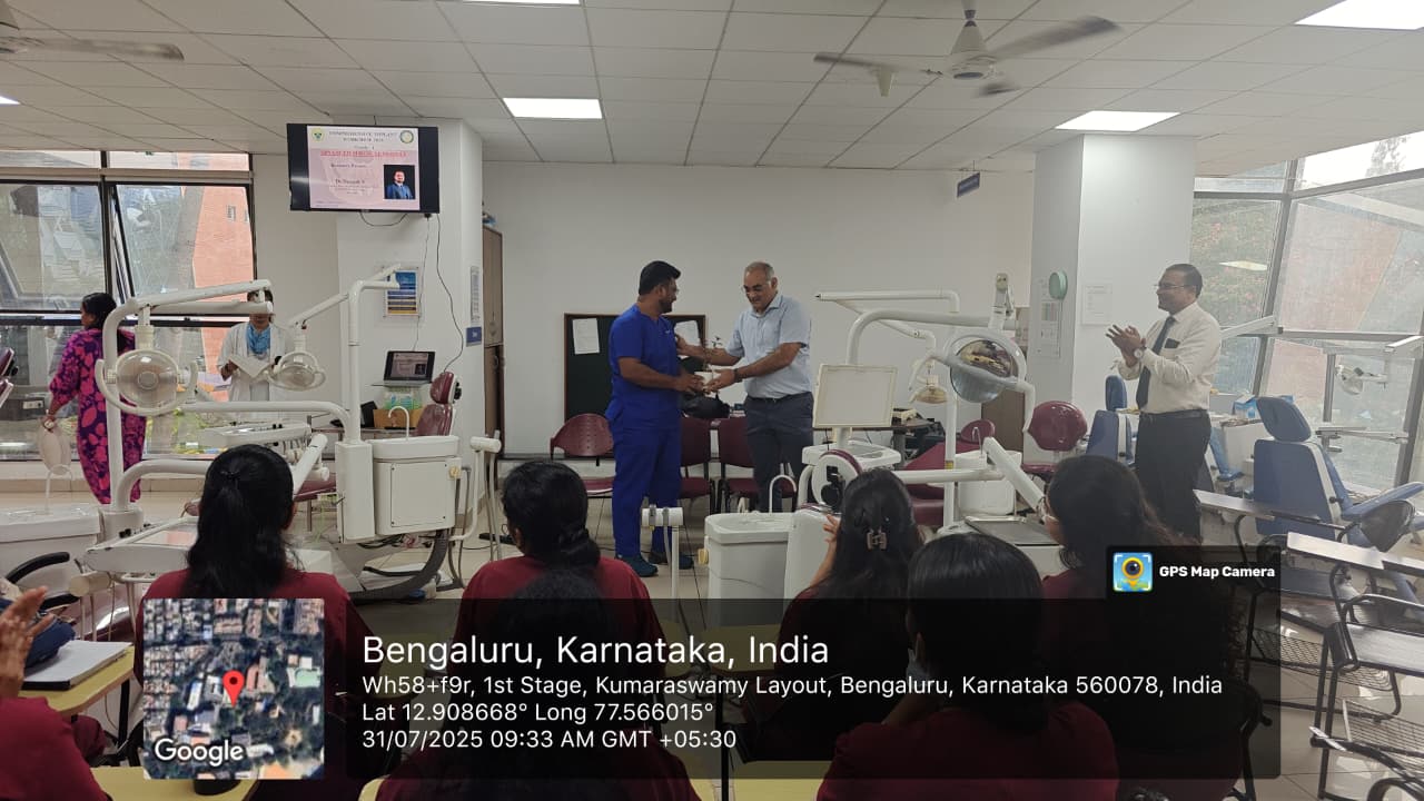 Oral Hygiene Day was celebrated with great enthusiasm by the Department of Periodontology, DSCDS, as part of a week-long series of events from 1st to 6th August 2025 with the theme “A happy mouth is a happy mind”. The celebrations aimed to promote oral health awareness among students, faculty, and the public, featuring activities such as an online Slogan Writing Competition on the theme “Oral Health and Hygiene”, an engaging “Just A Minute” contest for interns, and free distribution of oral hygiene aids to patients visiting the department throughout the week. The highlight of the celebrations was a vibrant Oral Hygiene Day Webinar, held on 4th of August 2025 , commemorating the birth anniversary of Dr. G. B. Shankwalkar, a pioneer in Indian Periodontology. The webinar featured an inspiring session by Dr. Abhilash Neelakanti, a proud alumnus of DSCDS and a respected professional in the field. he spoke on influence of periodontal disease on Systemic health. Dr. Savita AM, Head of the Department, delivered an encouraging address, while Dr. Archana hosted the competitions with enthusiasm. The event was smoothly anchored by Dr. Sravani, who also delivered the vote of thanks. Dr. Pallavi took charge of the overall coordination of the program, and Dr. Ashwin managed the audiovisual arrangements. The postgraduate students of the Department of Periodontology actively participated, ensuring the event's success. The celebrations concluded on a high note with prize distribution by the dignitaries followed by refreshments, making it a memorable occasion for all.
