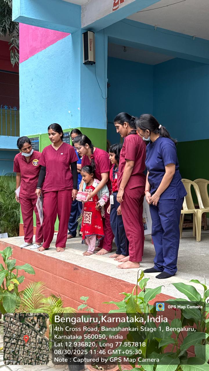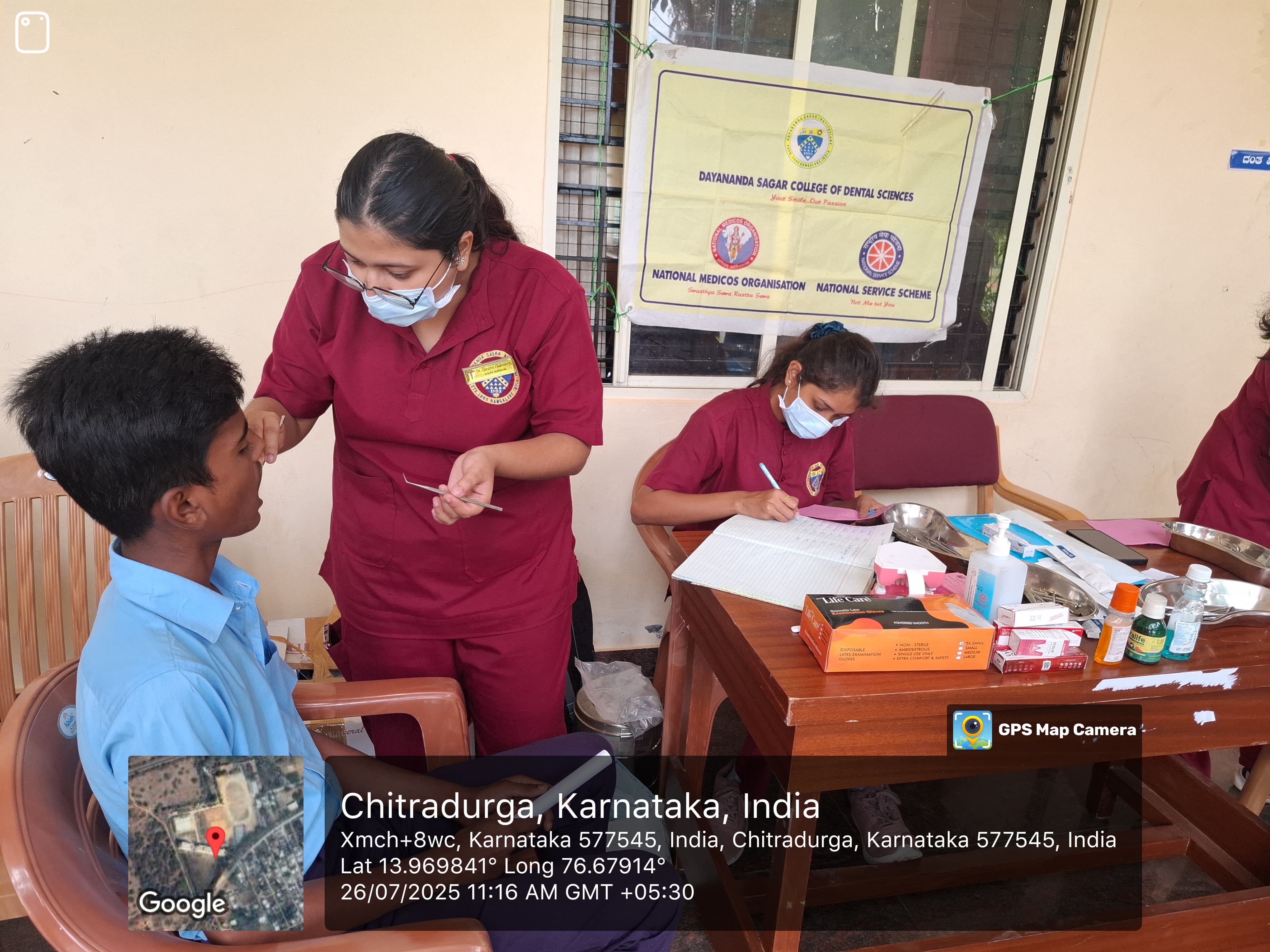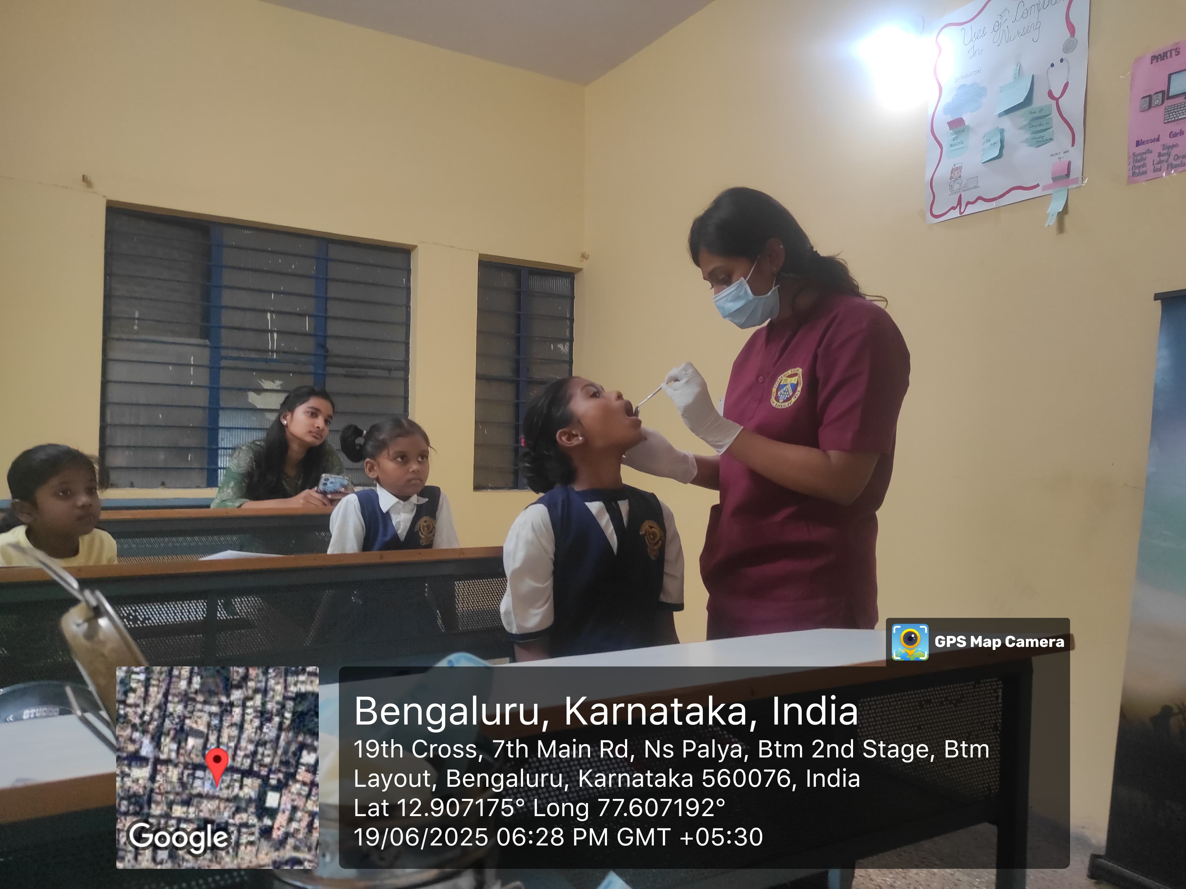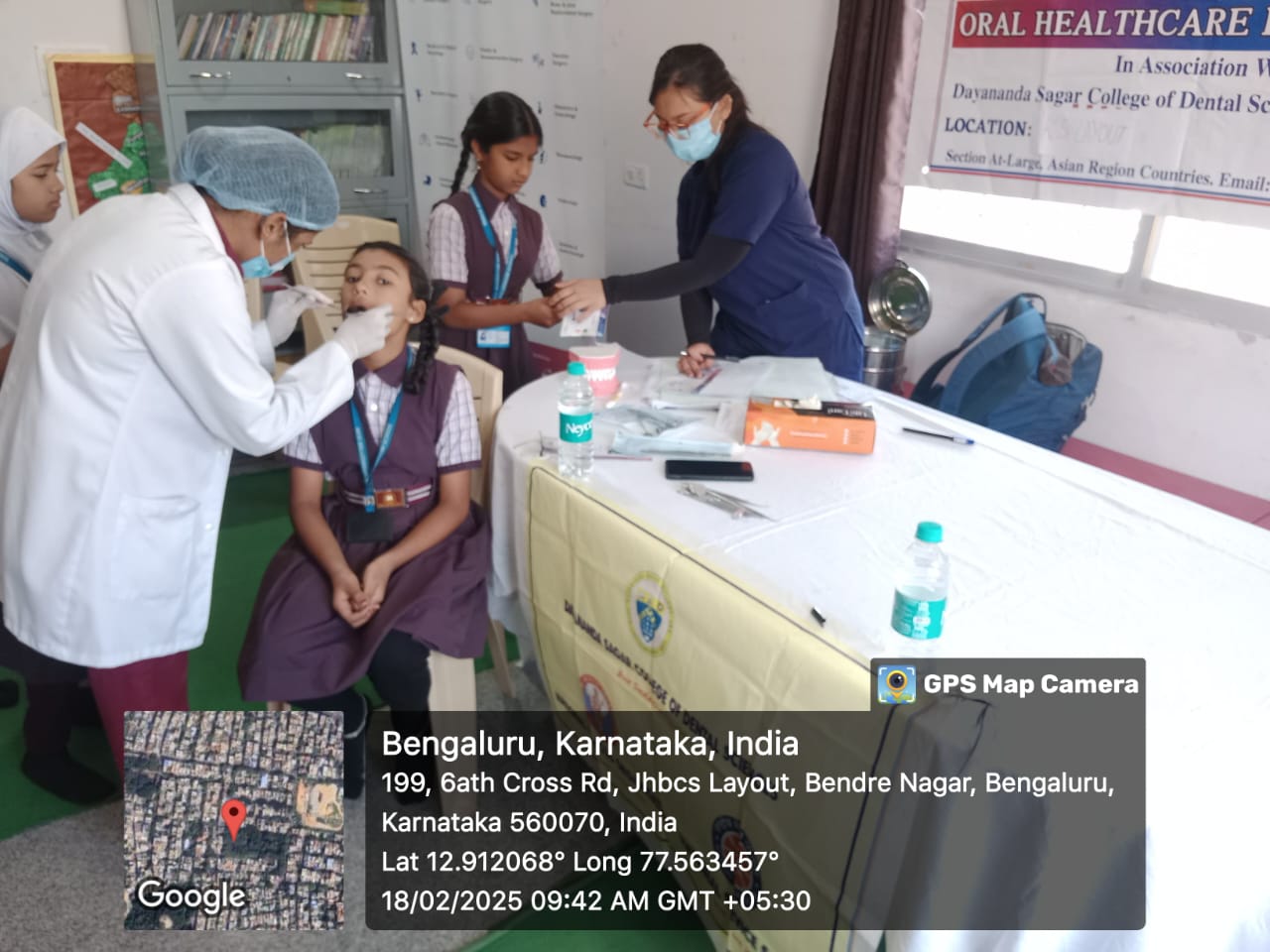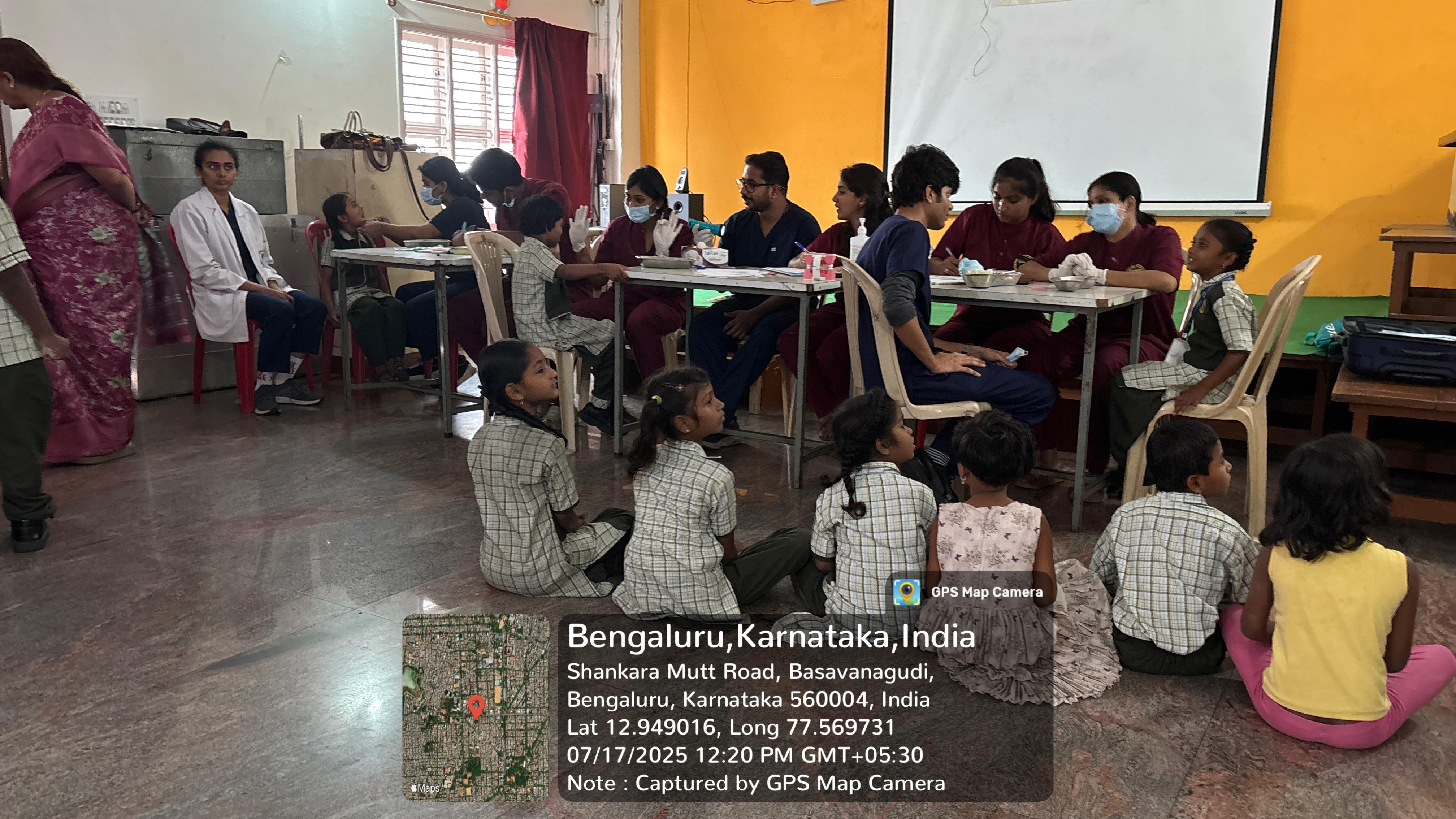 An outreach dental screening program was organized at Women’s Peace League School, Basavanagudi on 17th July 2025. The designated location of the camp was about 7 kms from the college. Intern Thejas Shekar, Yukthi SM, Yashika Shinde, Vaishnavi , Aishwarya and PG Dr Sangamithra from Department of Public Health Dentistry, Dayananda Sagar College of Dental Sciences, participated in the program. The dental team started from the college at 9:15 AM and reached the camp site at 09:45 AM. The camp started at 10:00 AM and went on till 4:00 PM. Awareness about oral hygiene, brushing techniques were given. The team left the camp site by 4:15pm and reached the college by 4:45 pm.
