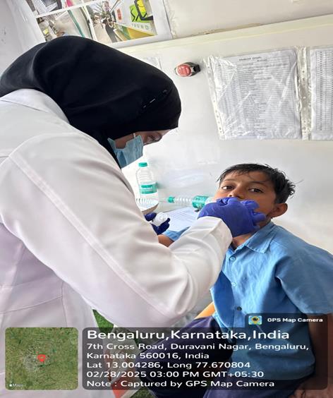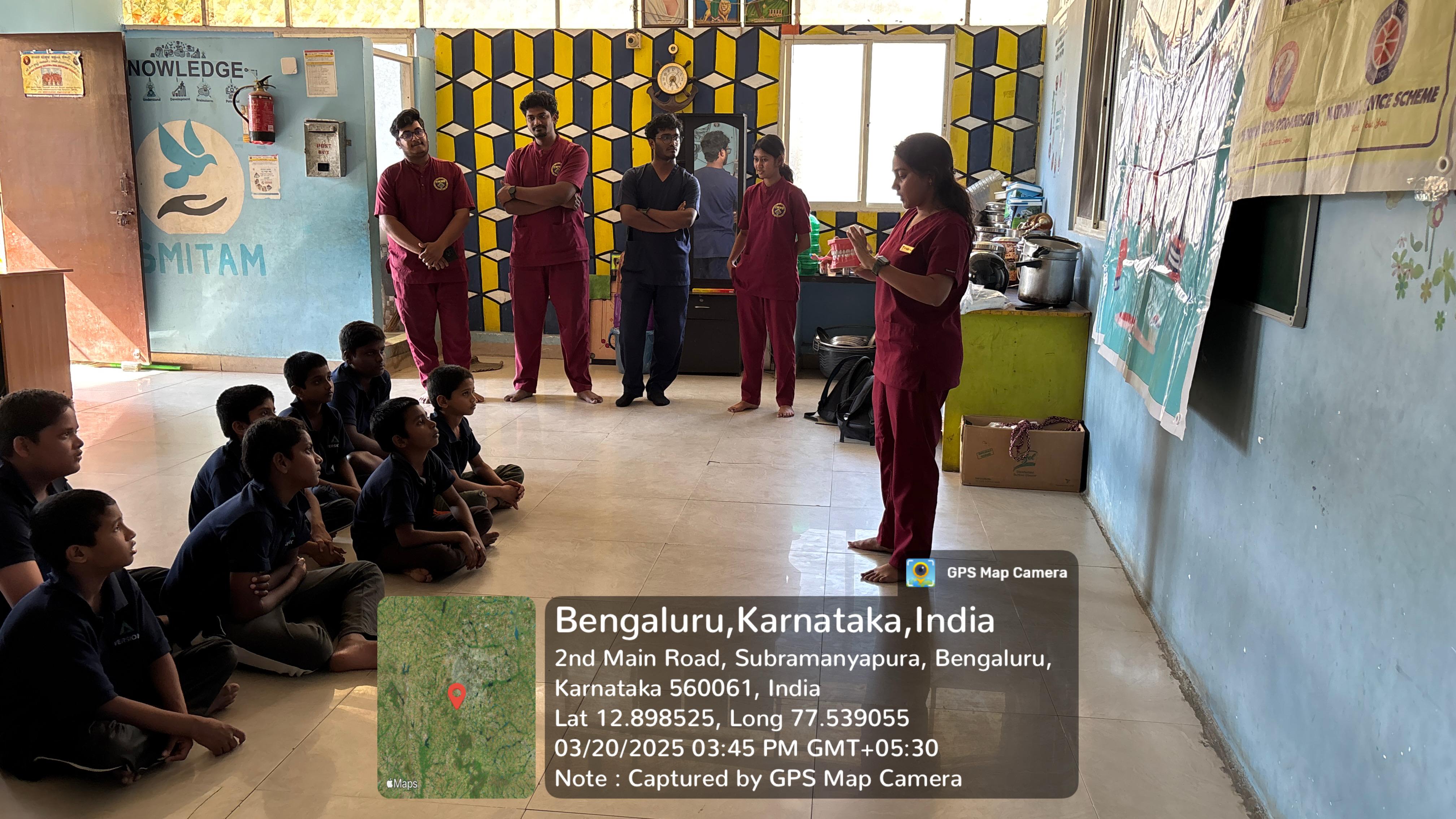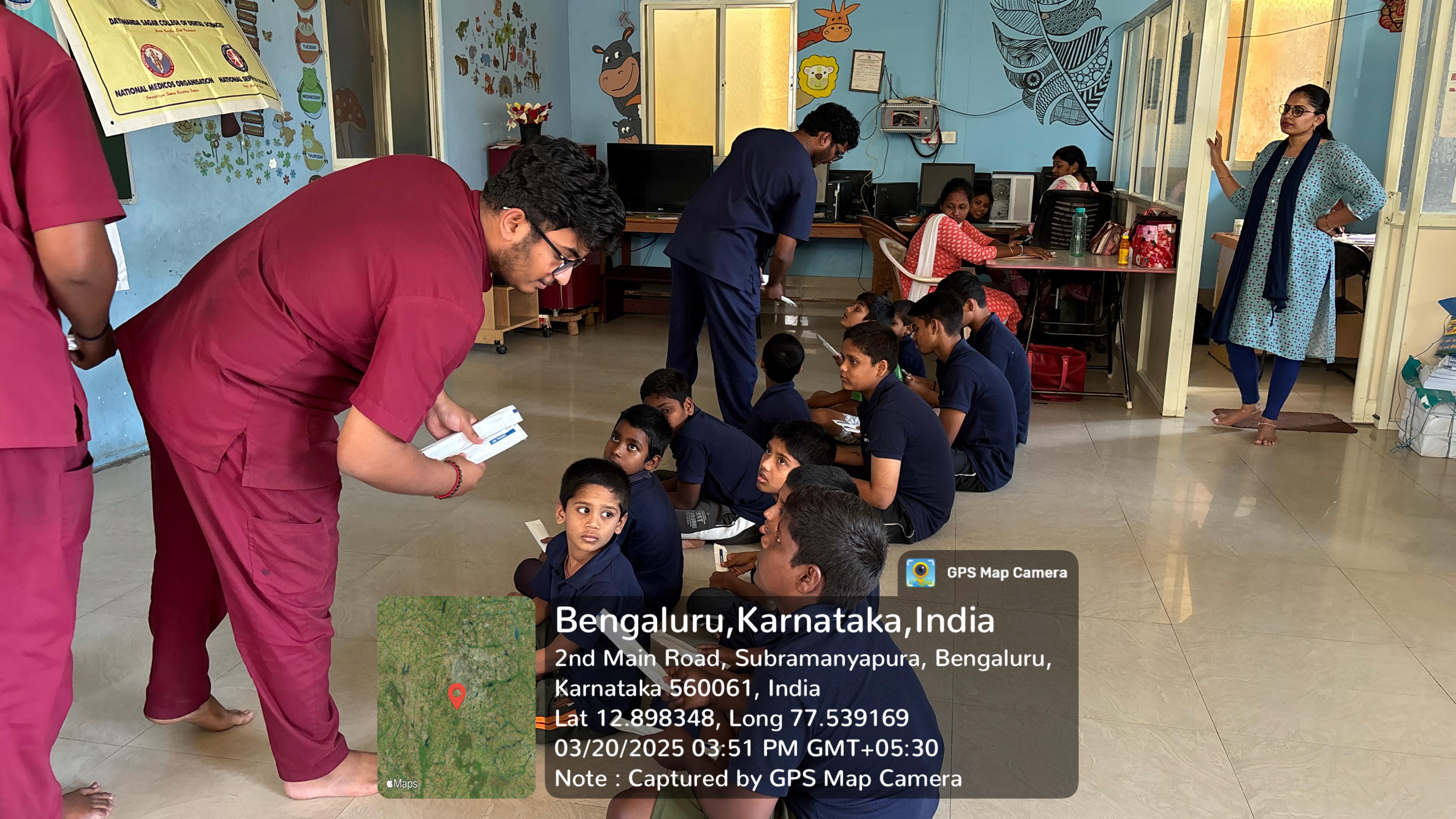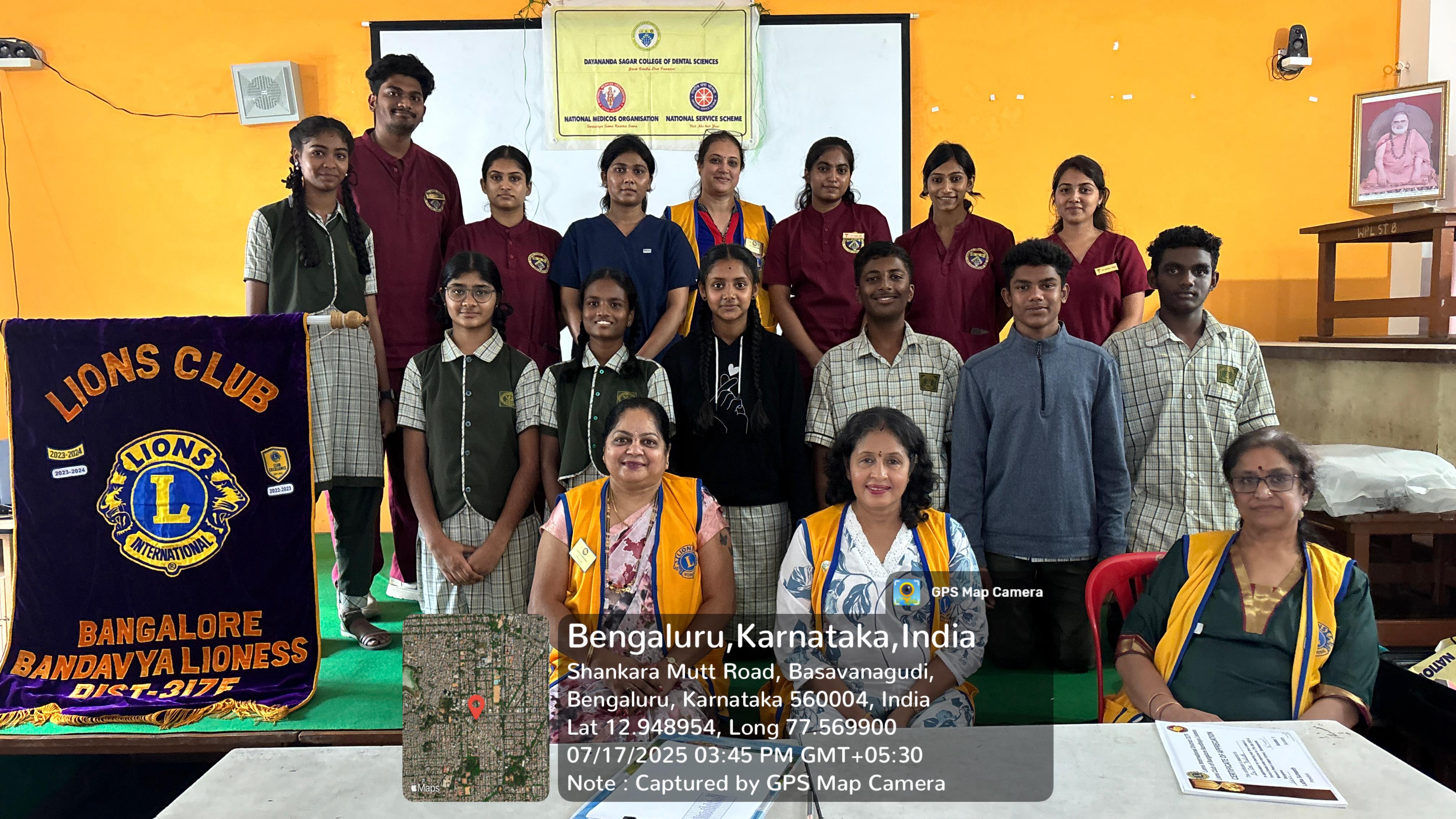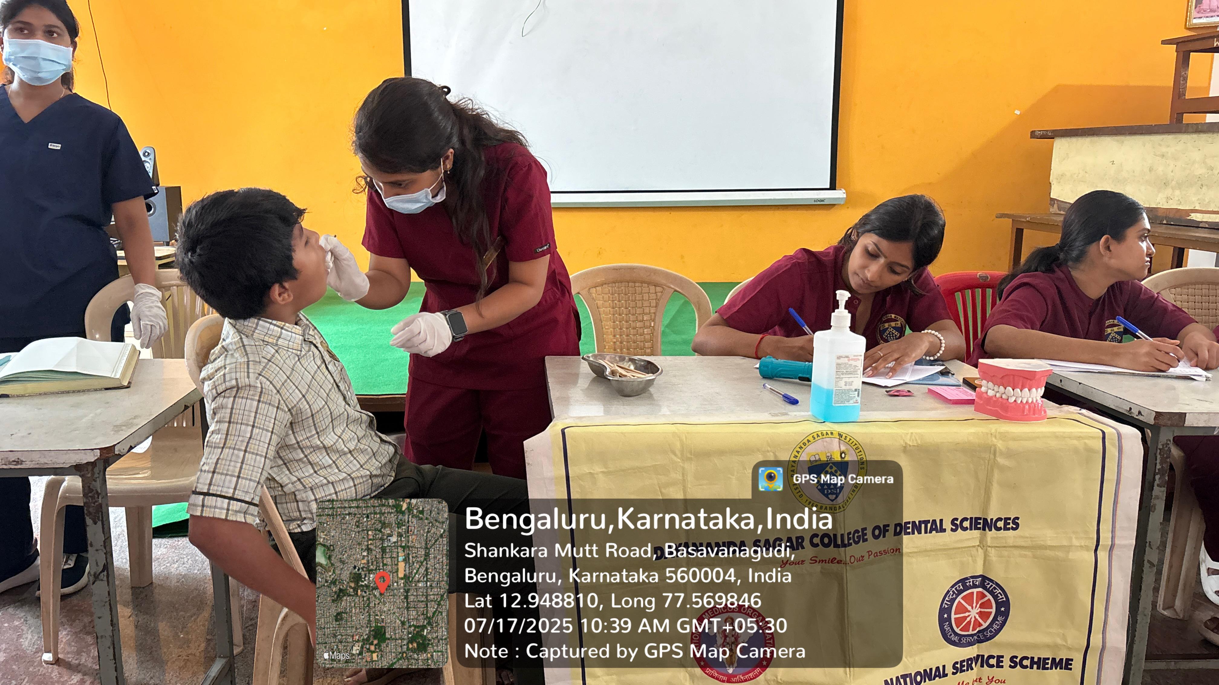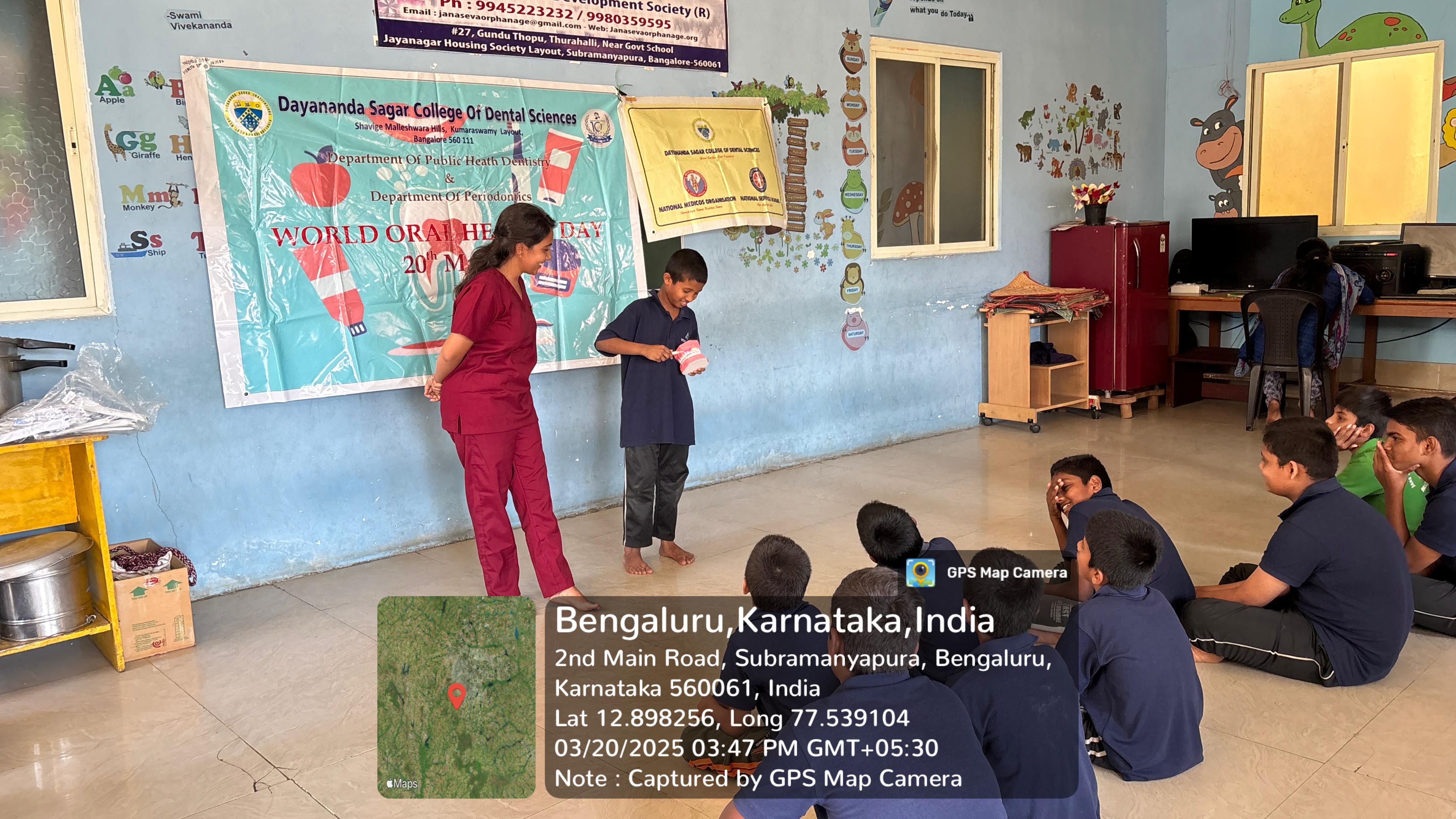 An outreach dental screening program was organized at Women’s Peace League School, Basavanagudi on 17th July 2025. The designated location of the camp was about 7 kms from the college. Intern Thejas Shekar, Yukthi SM, Yashika Shinde, Vaishnavi , Aishwarya and PG Dr Sangamithra from Department of Public Health Dentistry, Dayananda Sagar College of Dental Sciences, participated in the program. The dental team started from the college at 9:15 AM and reached the camp site at 09:45 AM. The camp started at 10:00 AM and went on till 4:00 PM. Awareness about oral hygiene, brushing techniques were given. The team left the camp site by 4:15pm and reached the college by 4:45 pm.