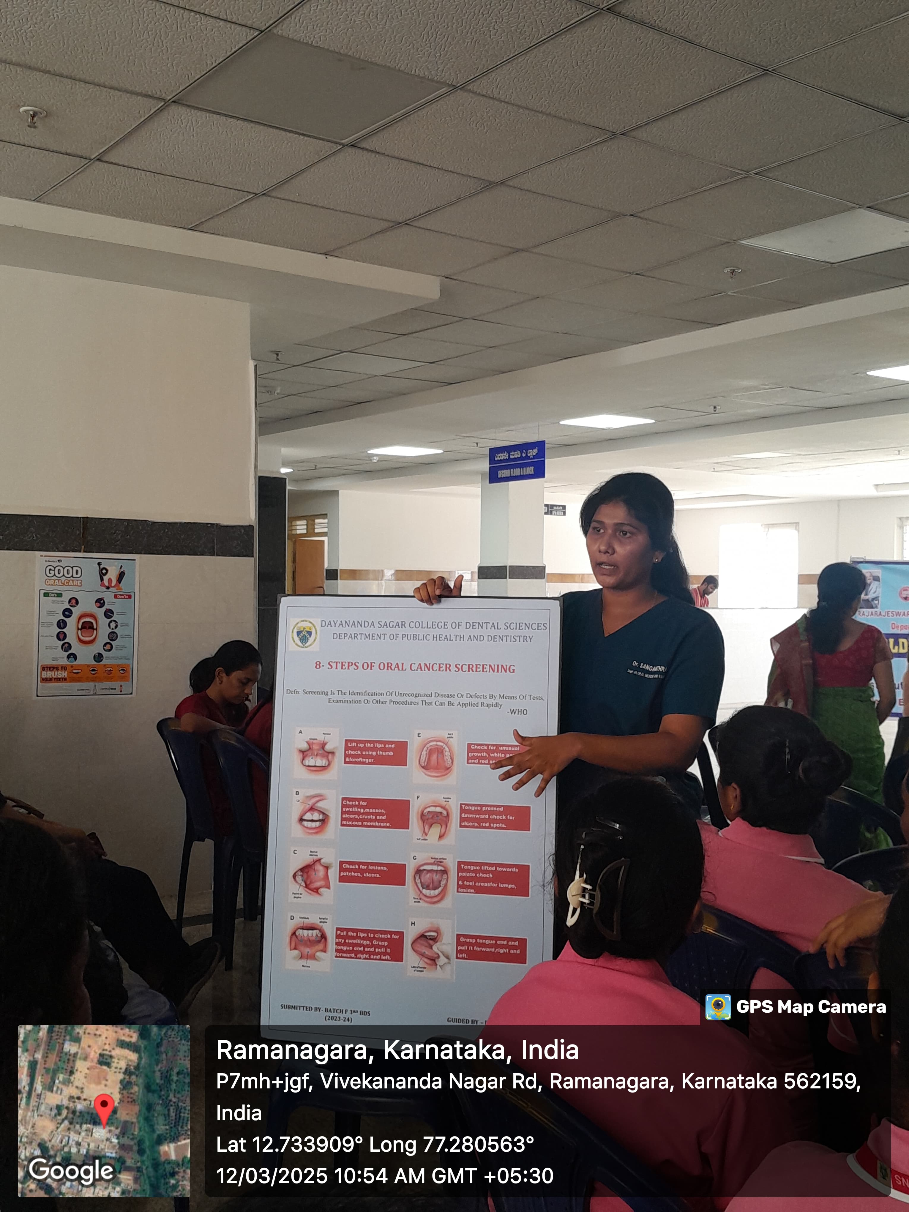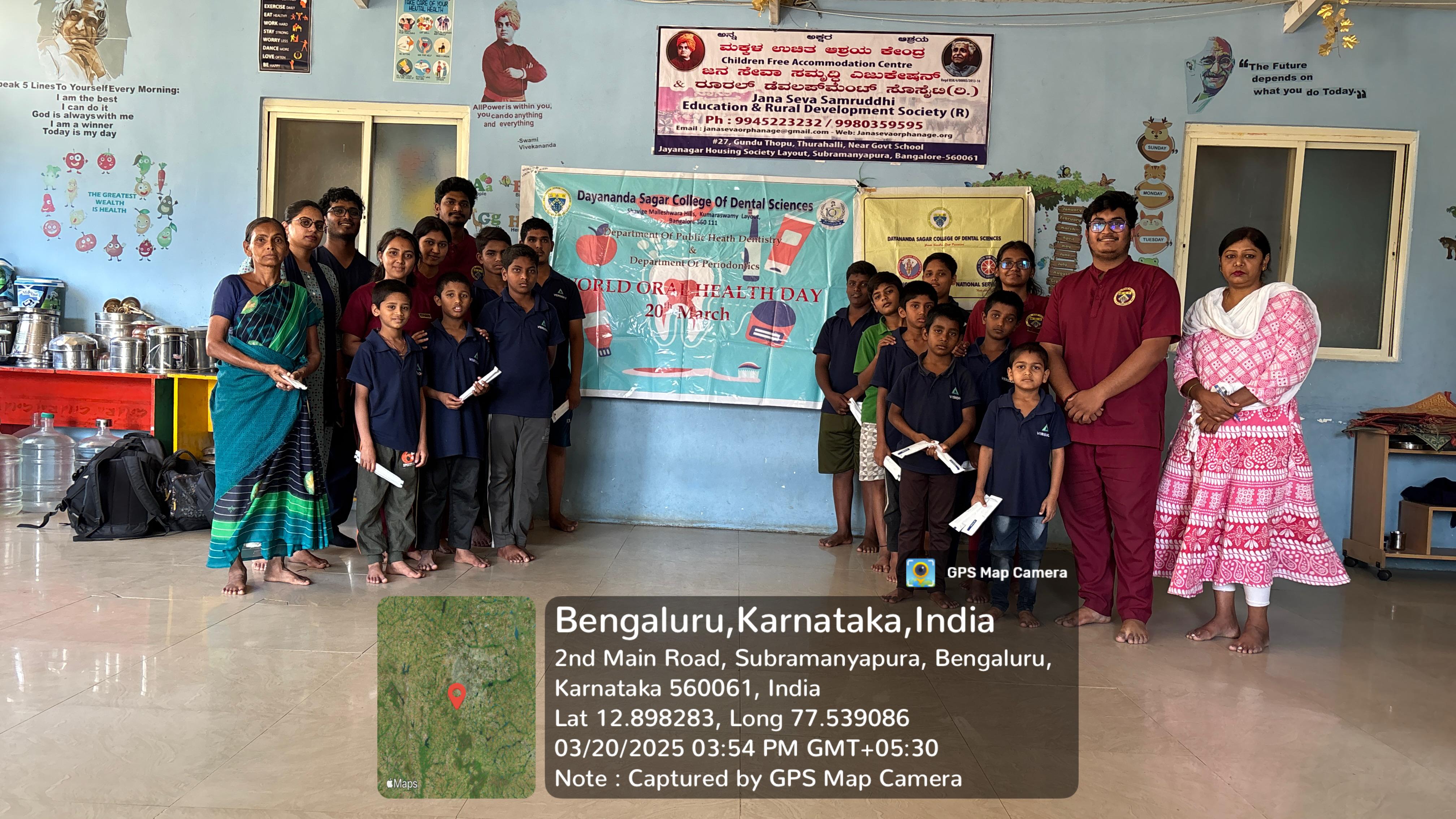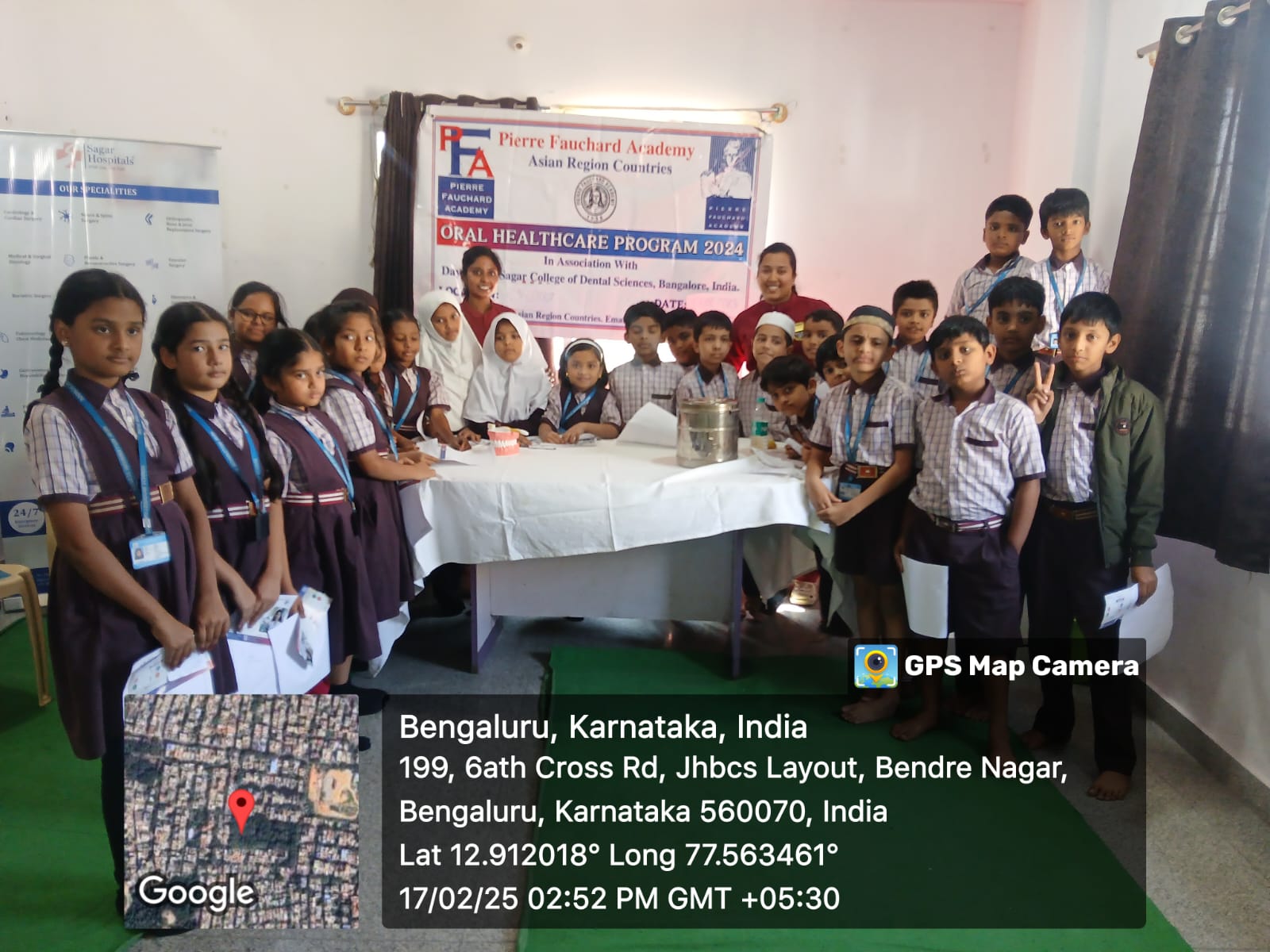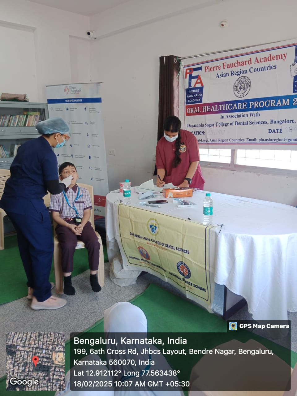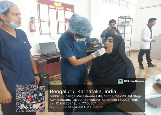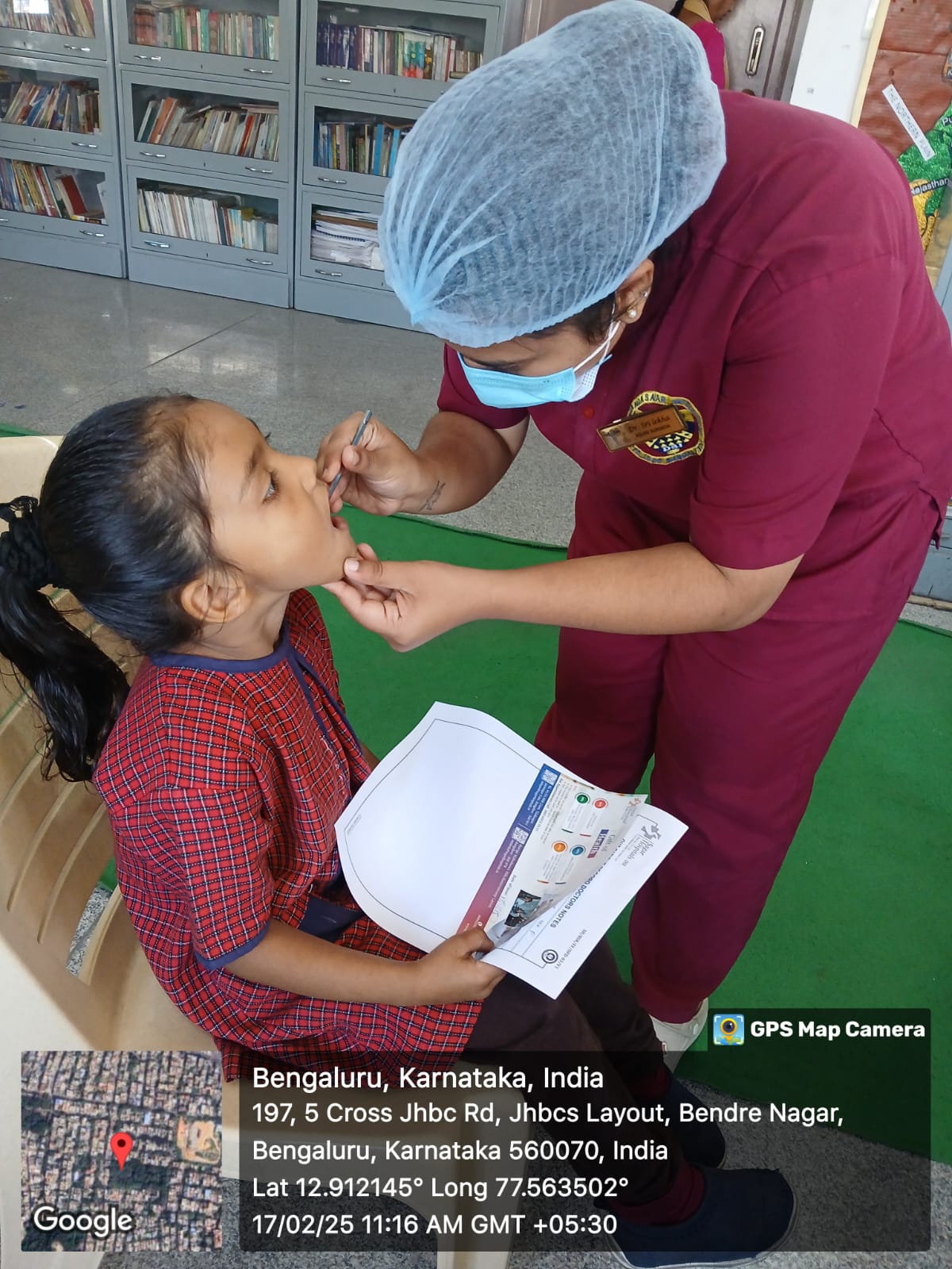 An outreach dental screening program was organized at Women’s Peace League School, Basavanagudi on 17th July 2025. The designated location of the camp was about 7 kms from the college. Intern Thejas Shekar, Yukthi SM, Yashika Shinde, Vaishnavi , Aishwarya and PG Dr Sangamithra from Department of Public Health Dentistry, Dayananda Sagar College of Dental Sciences, participated in the program. The dental team started from the college at 9:15 AM and reached the camp site at 09:45 AM. The camp started at 10:00 AM and went on till 4:00 PM. Awareness about oral hygiene, brushing techniques were given. The team left the camp site by 4:15pm and reached the college by 4:45 pm.