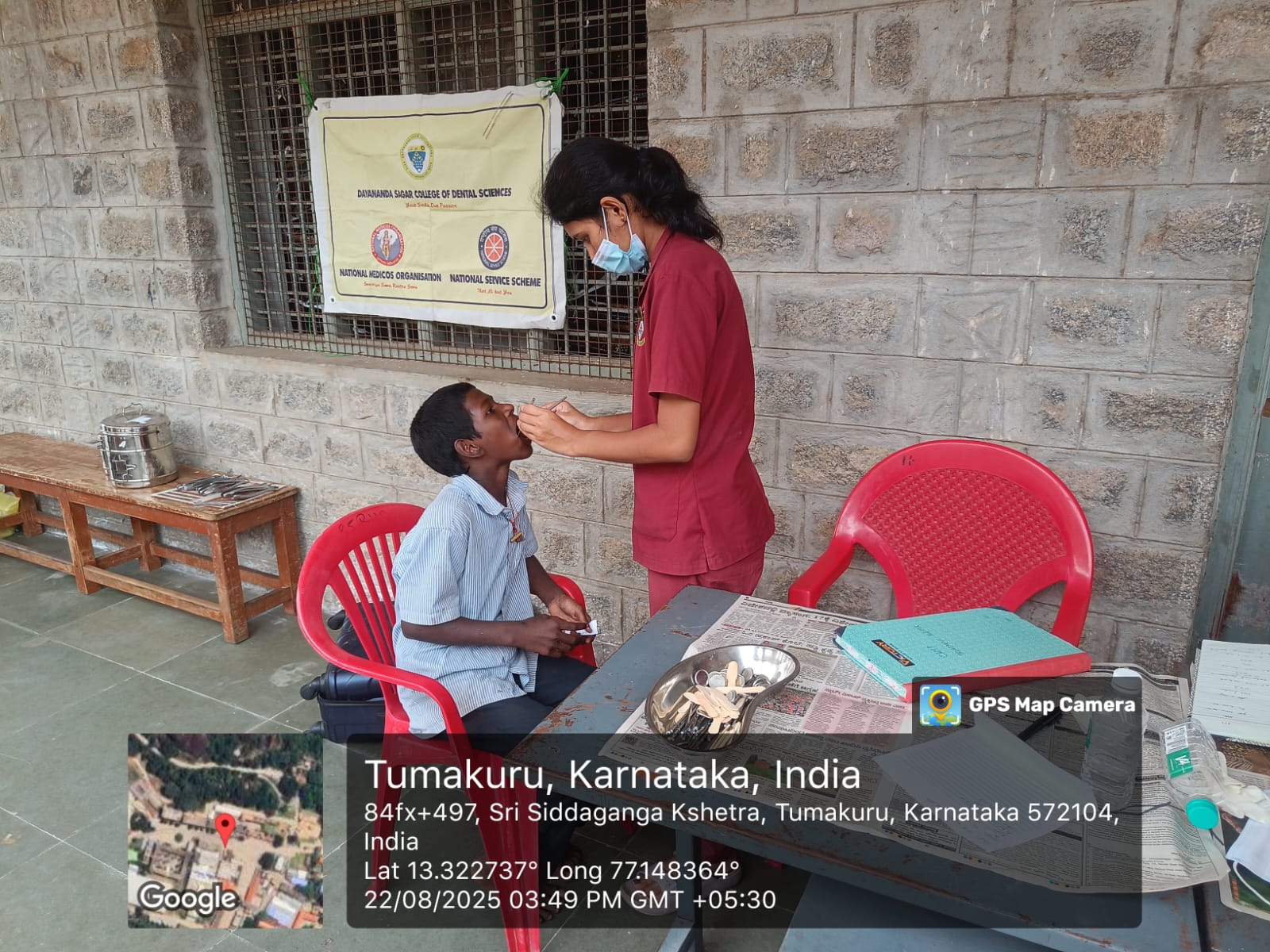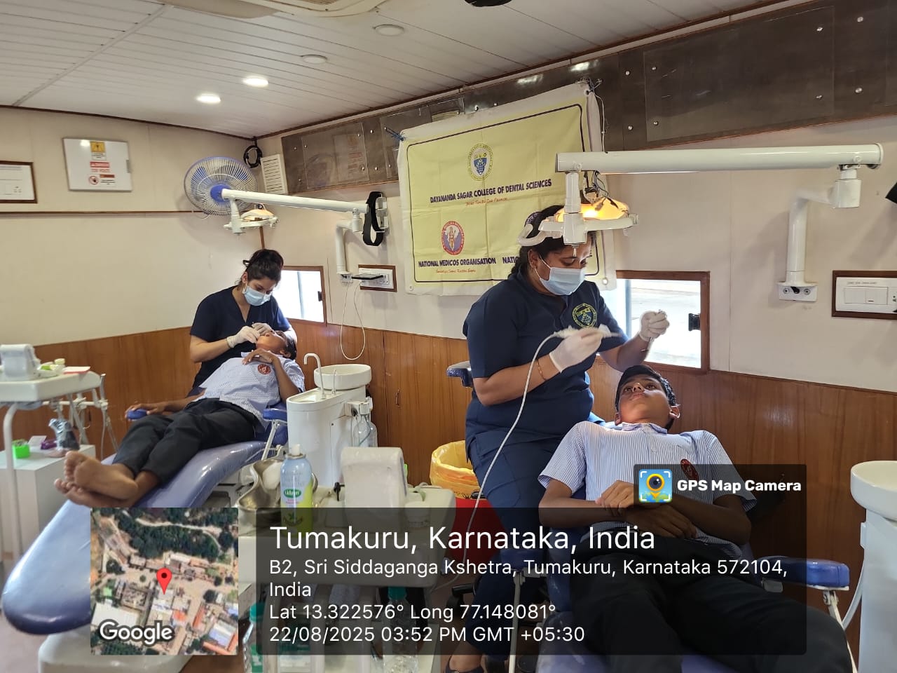 An outreach dental screening program was organized at Shree Siddaganga Mutt, Tumkur , approximately 76 kms from college. A team of dental doctors from Dayananda Sagar College of Dental Sciences headed by Dr Avinash J , HOD , Department of Public Health Dentistry, Dr Venkat R , HOD, Department of Pediatrics and Preventive Dentistry, PG’s and Interns participated in the program. The dental team started from college at 06:30am in the fully equipped Mobile Dental Unit/Bus and reached the camp site by 08:30am. Breakfast was served by the organizers at the camp site. The students of the Siddaganga mutt residential school, Tumkur were screened and the dental treatments were provided to all the students and the staff. The treatments provided were Scaling, restorations, extractions, RCT. The camp ended by 5:30pm. We were arranged the stay in a guesthouse at Siddaganga Institute of Technology which was approximately 2.5kms from mutt.