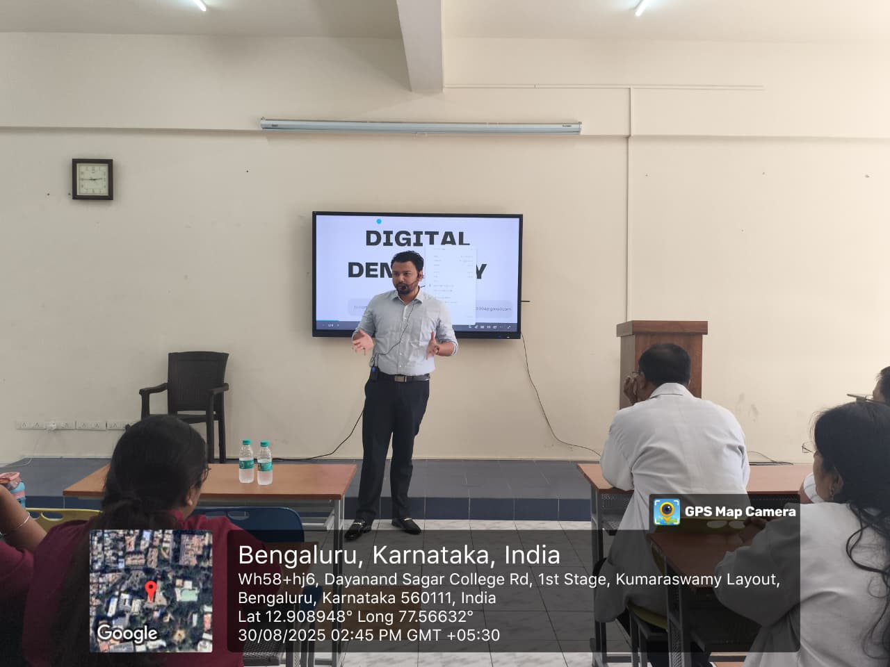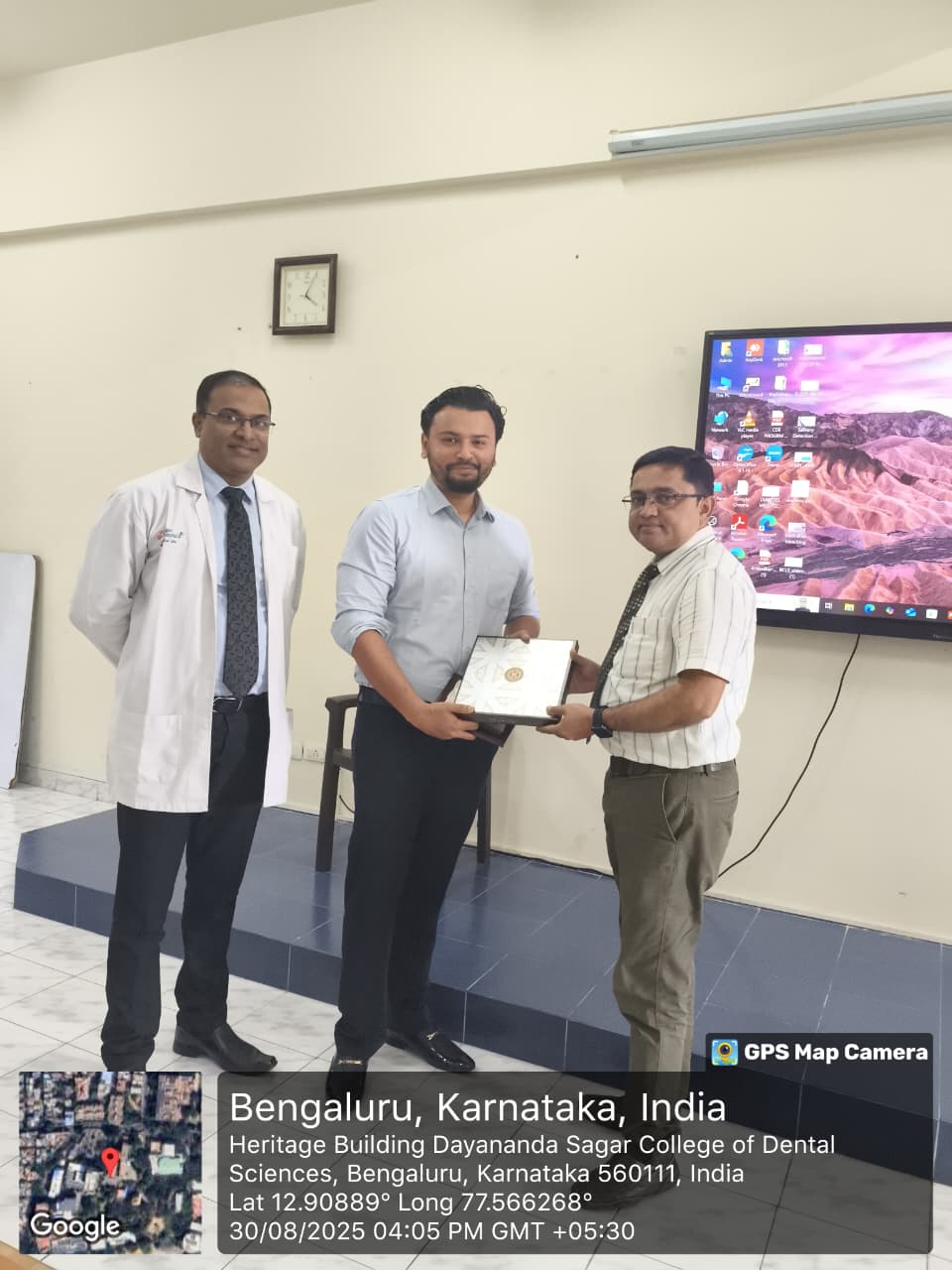 The Alumni Knowledge Exchange program in association with Career Guidance & Placements Committee of DSCDS, conducted a program on “CAD/CAM & Digital Dentistry” by our Alumni of 2013-2019 Batch- Dr. Parth Pratik which started at 2:15 pm on 30/08/2025. Dr Shreyasee Maity along with our Vice Principal Dr. Avinash J & Our Associate Dean of UG Studies Dr. Krishnanand introduced the speaker and welcomed the gathering with the Secretary of the DSCDS Alumni Association Dr.Vinod Rangan.
