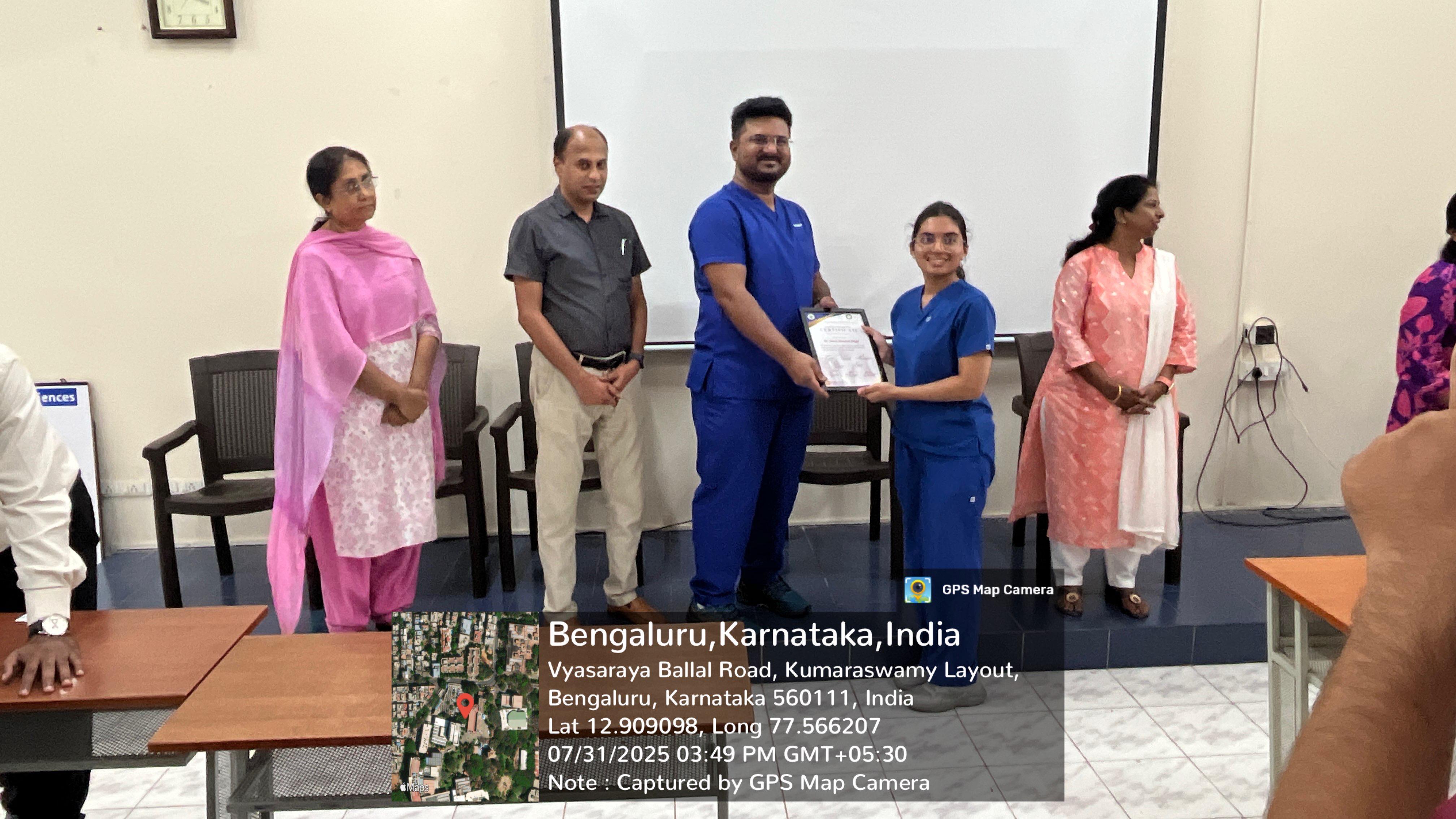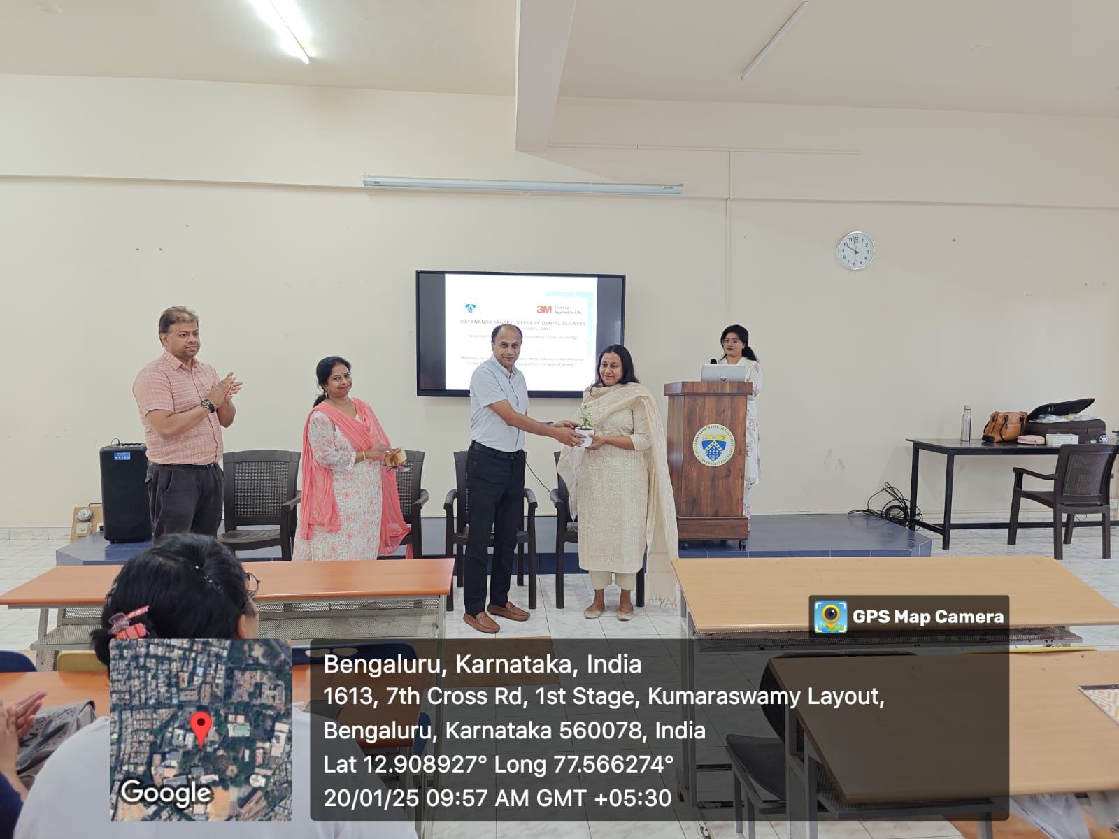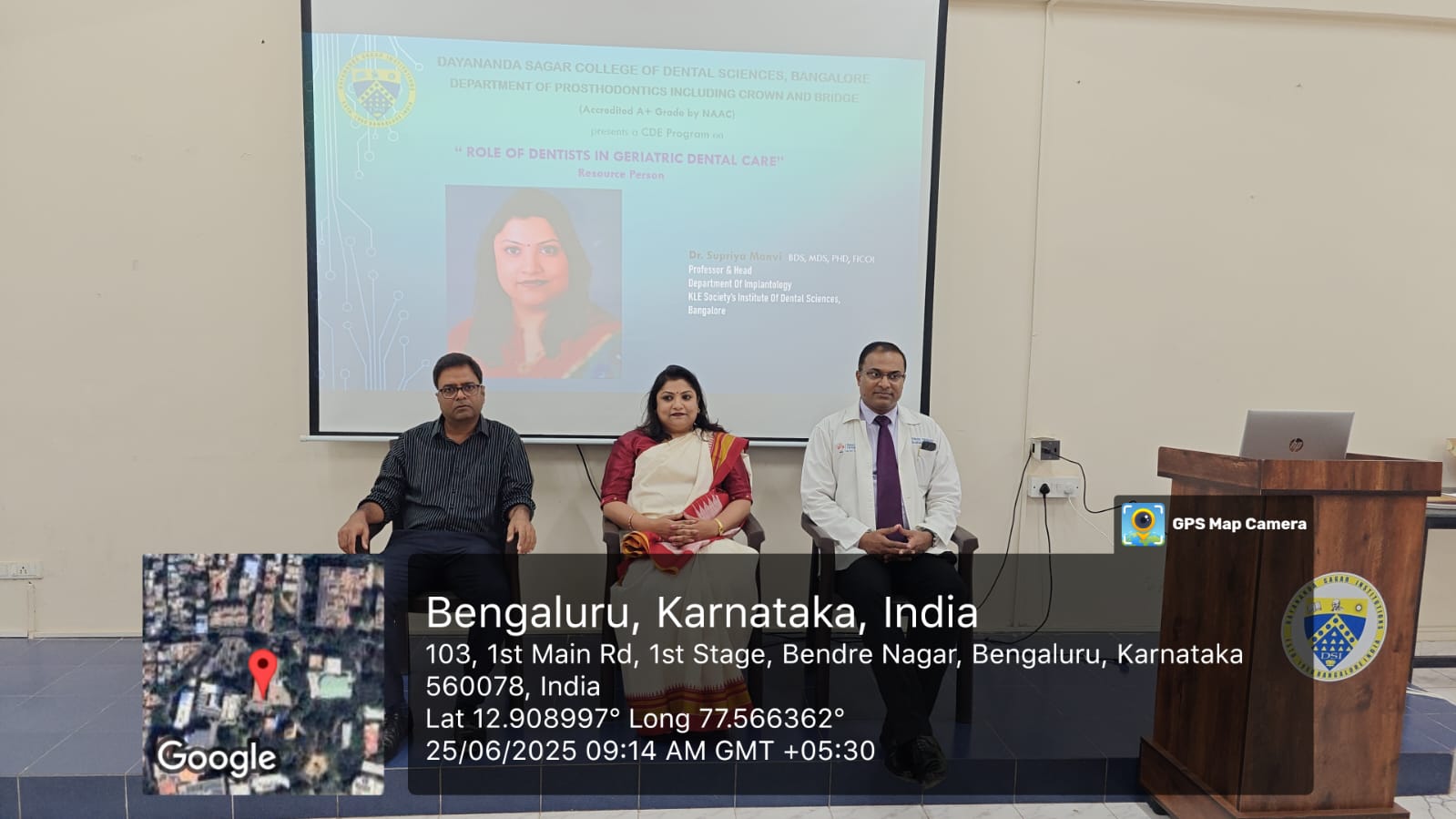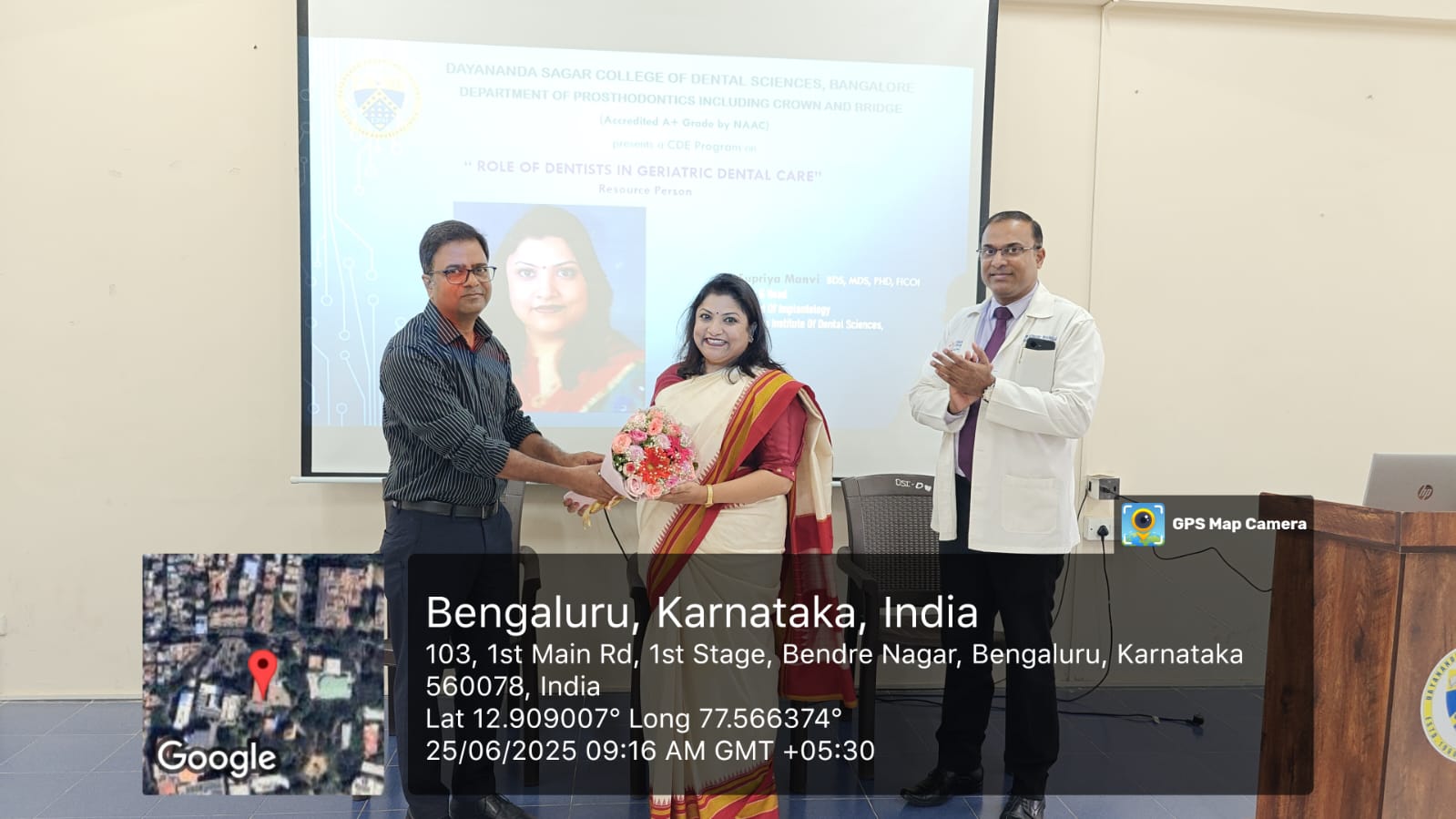 The Department of Prosthodontics successfully organized a lecture program on Geriatric Dentistry, featuring Dr. Supriya Manvi as the invited guest speaker on 25-06-2025. Dr. Supriya Manvi delivered a comprehensive lecture on "The Role of Dentist in Geriatric Dental Care" highlighting the unique challenges and considerations in managing the oral health of elderly patients. The program was attended by dental interns and postgraduate students, who benefited from her expertise and insights. The session provided valuable knowledge and perspectives on delivering optimal dental care to geriatric patients. The program concluded with a valedictory ceremony, during which the department expressed its sincere appreciation and gratitude to Dr. Supriya Manvi for sharing her expertise and enriching the learning experience of the participants.