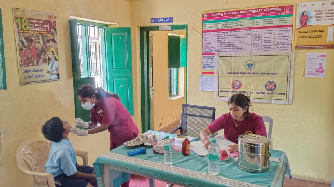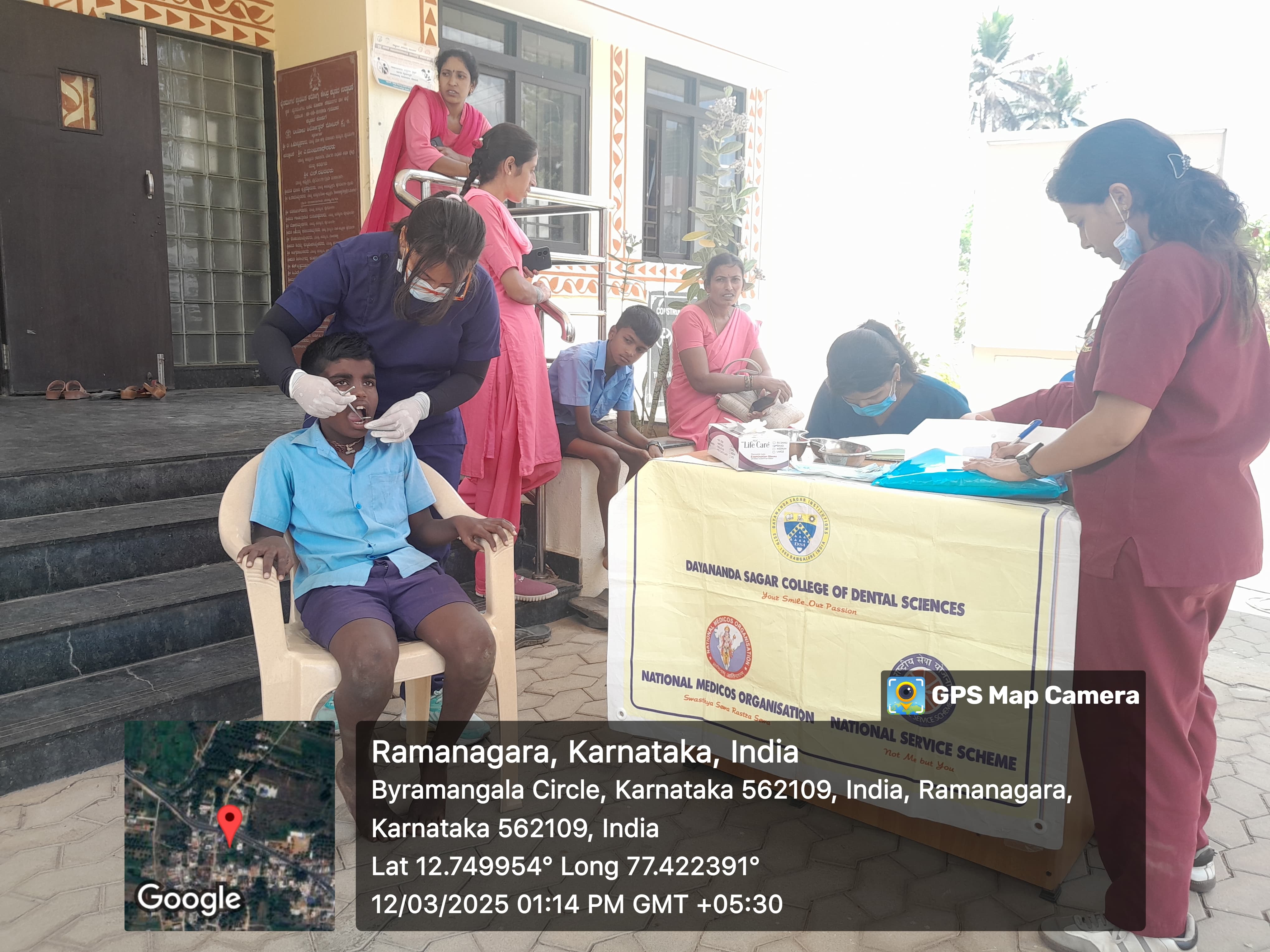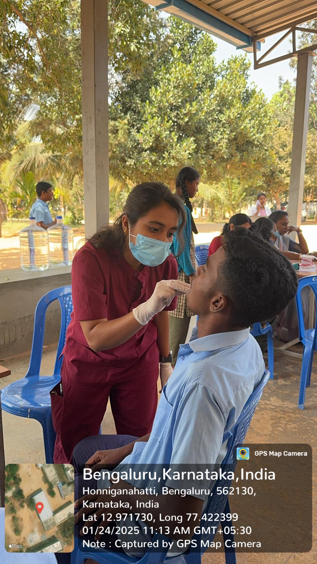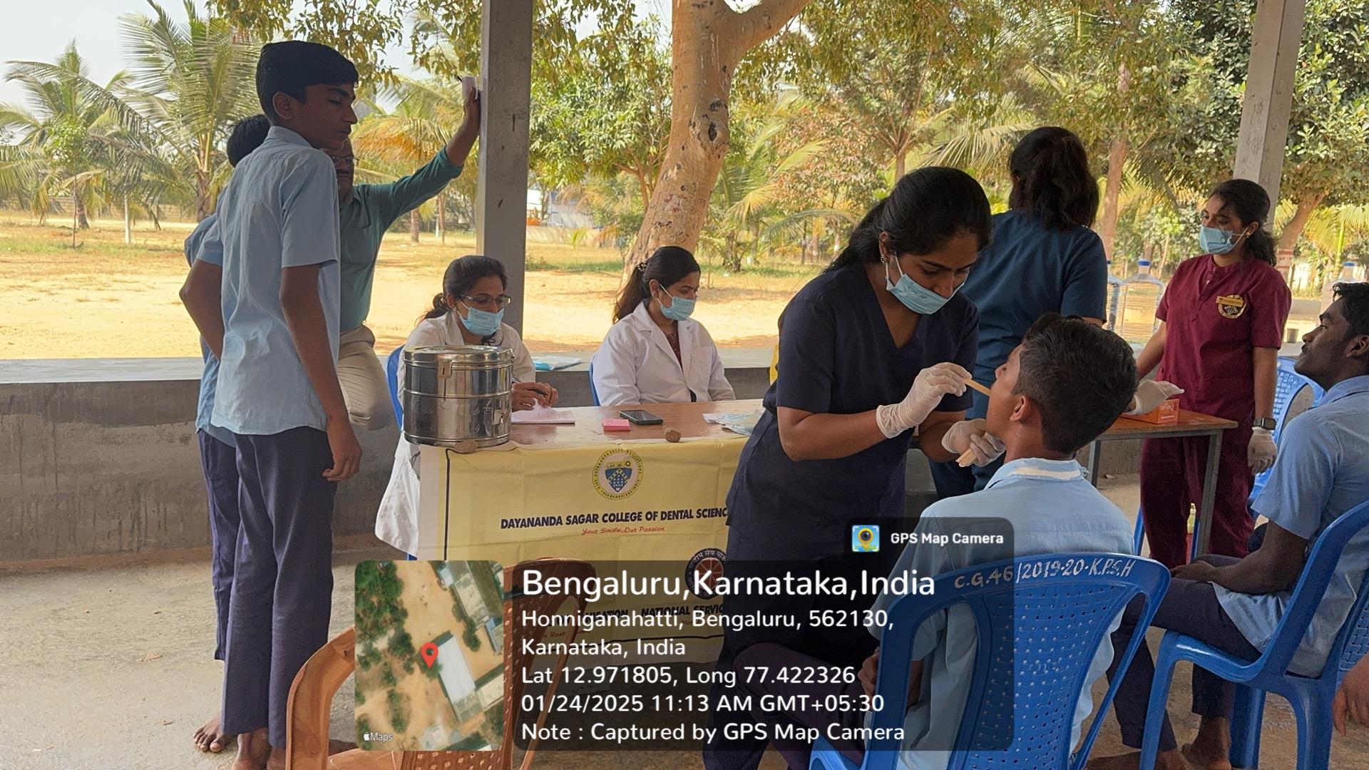 An outreach dental screening program was organized at Sri Vinayaka Vidya Samste, Srinivas Nagar, Bengaluru approximately 4 kms from college. A team of dental doctors from Dayananda Sagar College of Dental Sciences headed by Interns participated in the program. The dental team started from college at 09:15am by cab and reached the camp site by 09:45am. The students of the Sri Vinayaka Vidya Samste , Bengaluru were screened and health education were provided to all the students and the staff. The camp ended by 2:00pm with a lunch break in between at 1:30 pm where lunch was provided. The team left the camp site by 02:00pm and reached the college by 02:15pm.