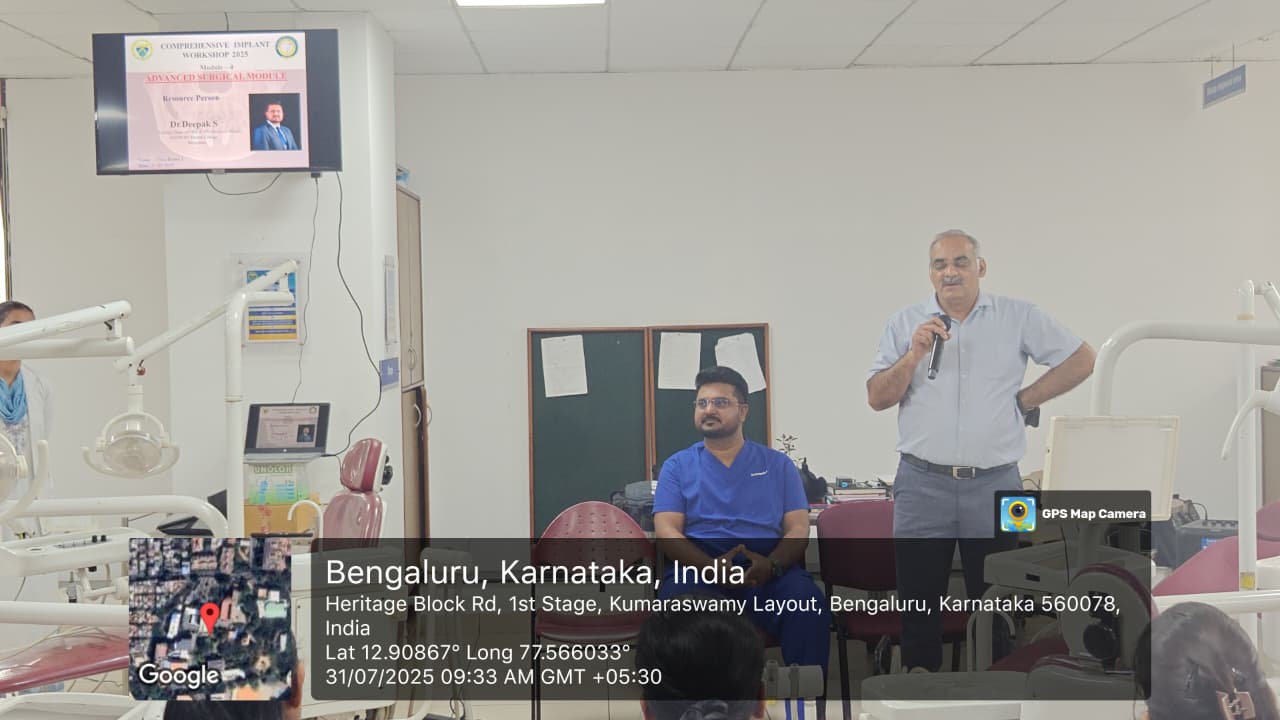 The Comprehensive Implant Workshop 2025, Module 4,was held on July 31st, 2025, focusing on Advanced Surgical Module. The program was led by esteemed Resource Person, Dr. Deepak S. He demonstrated two Advance surgical cases, including Direct and Indirect Sinus Lift Procedures, GBR with Implant placement, providing valuable insights into advanced implant surgical techniques. This was followed by a thought-provoking invited guest lecture delivered, which further enriched the participants' understanding of advanced surgical concepts.. An interactive session with the invited guest speaker provided participants with an opportunity to clarify doubts and gain deeper insights.